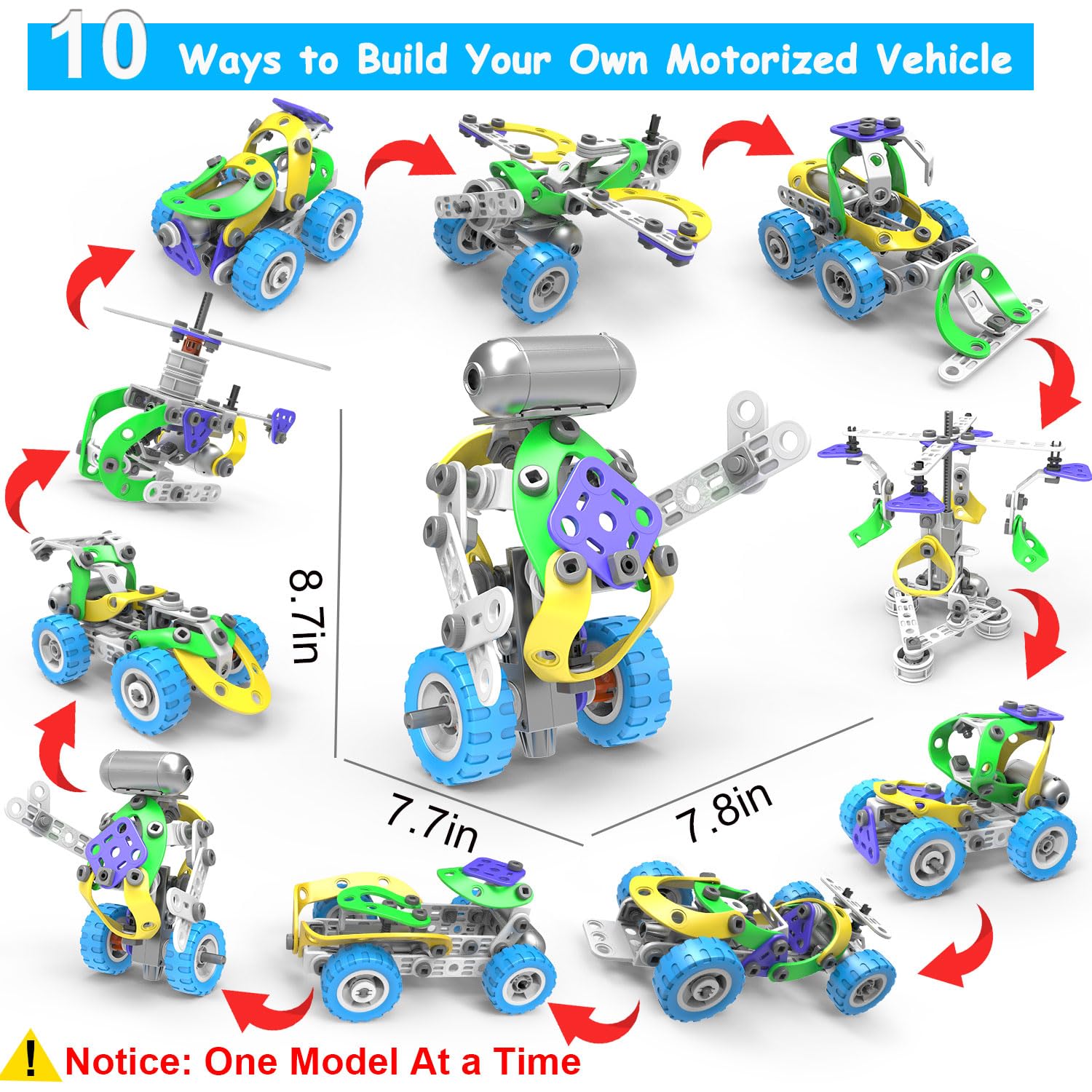 - 10-in-1 Ways to Play - Total 109 pieces toy building sets can be built into 10 different models, including bulldozer, rotary crane, plane, robot, helicopter, racing car, UTV car and other different cars. Including a step-by-step guide booklet for kids easy reference to build a variety of patterns. (Notice: one model at a time.) Best 5 6 7+ year old boy birthday gift ideas & boys toys age 6-8 8-10 years old .