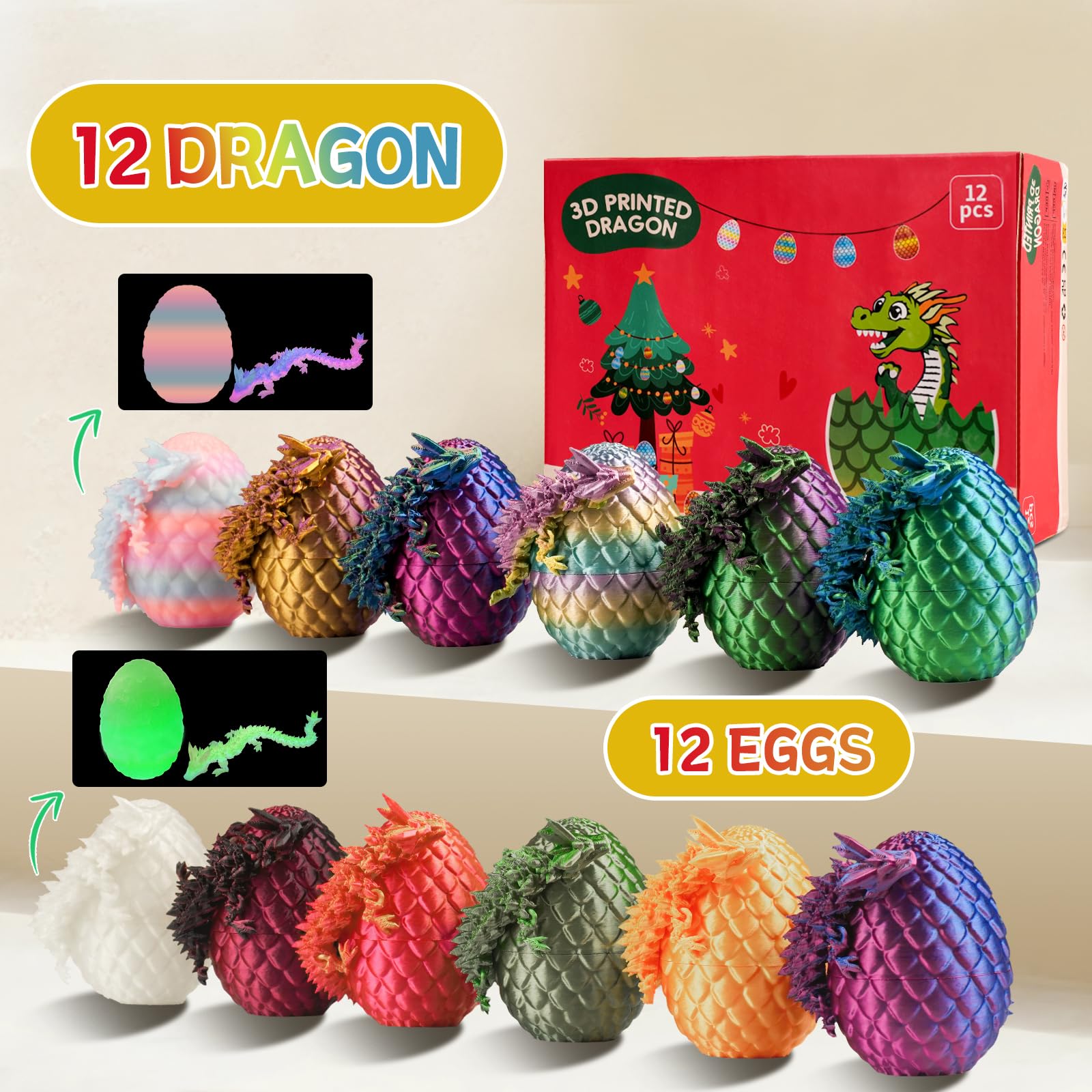 12PCS 3D Printed Dragon Eggs with Dragon Inside, Mini Dragon Egg Set, Articulated Crystal Dragon Fidget Toy for for Kids & Adults Gifts Christmas Ornament & Stocking Stuffers