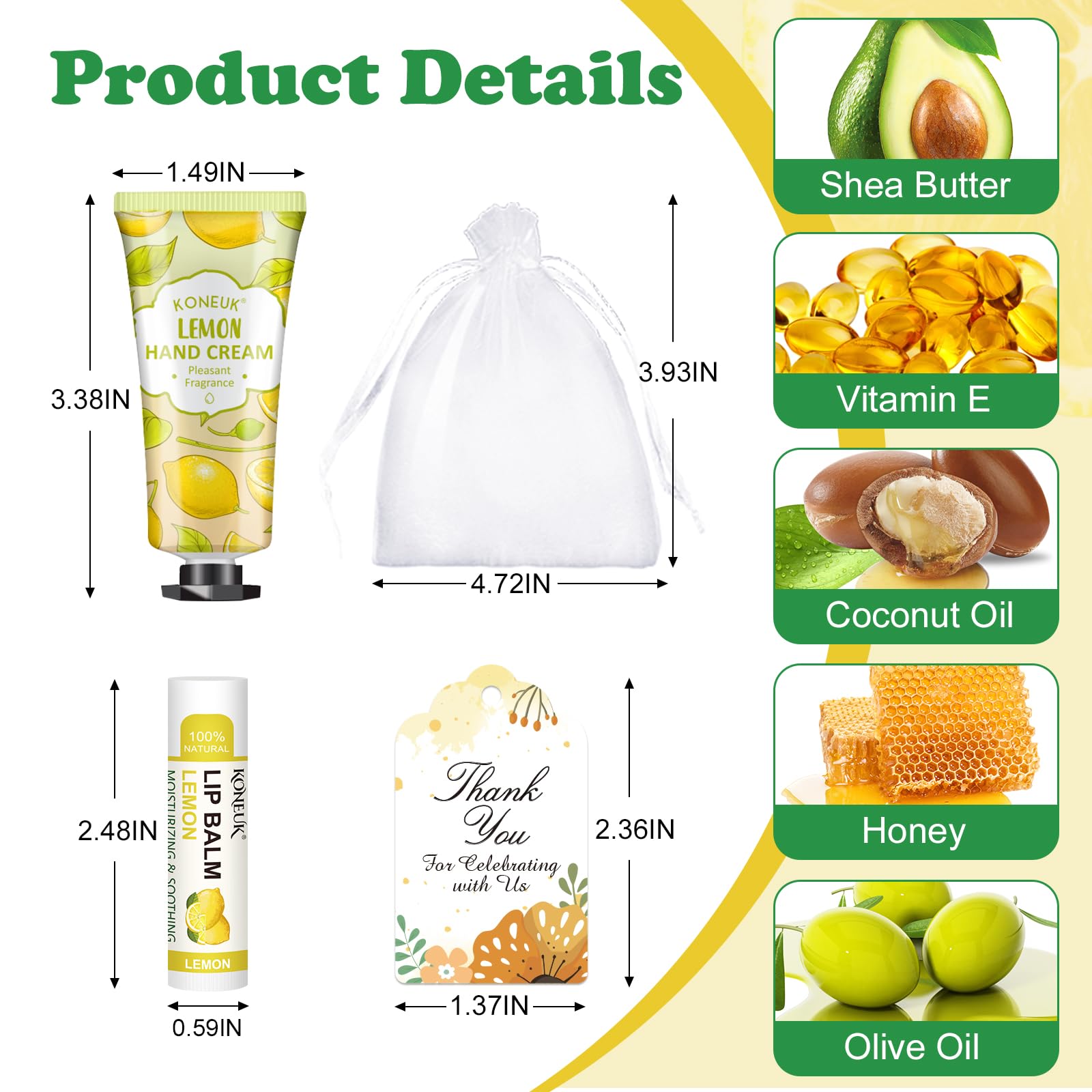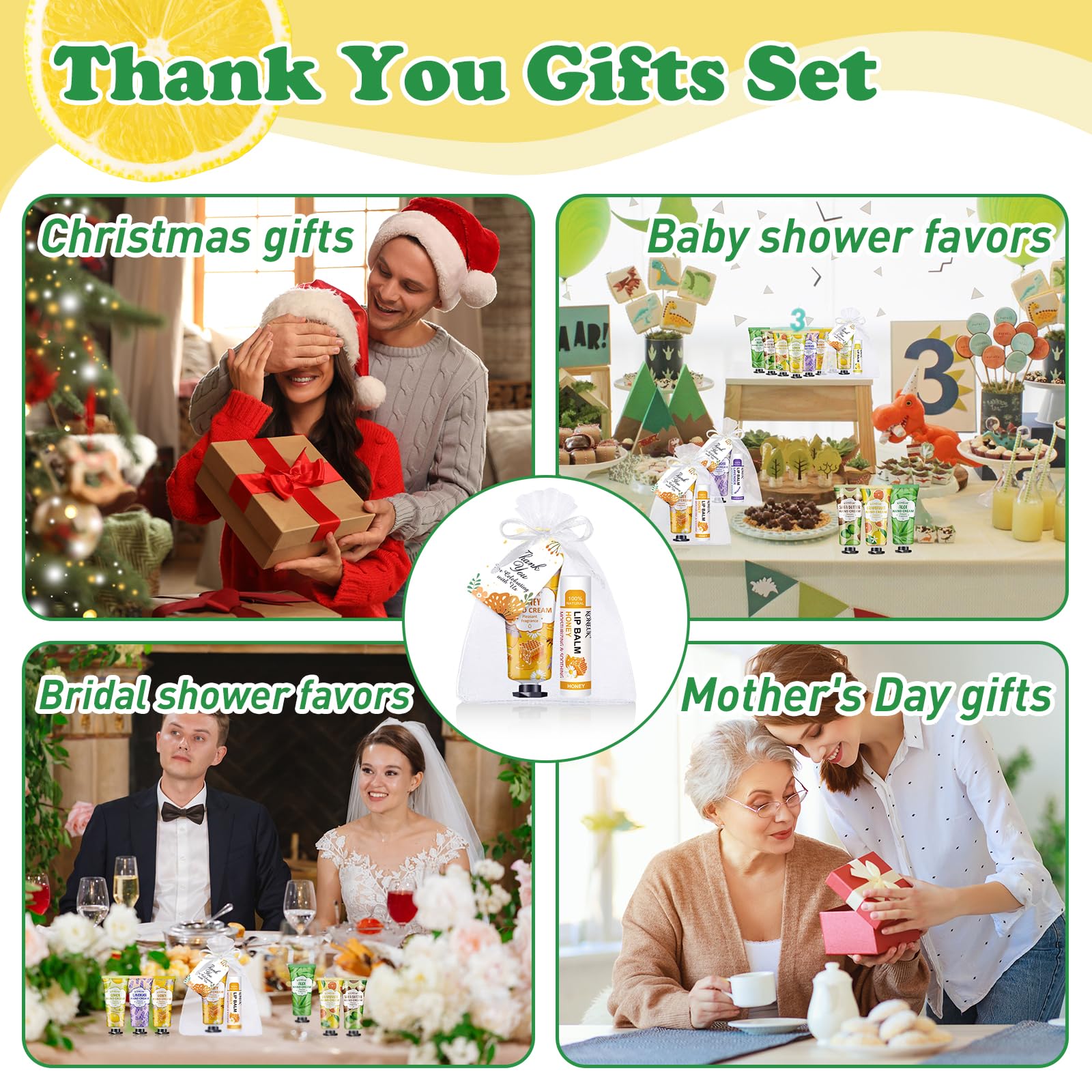 - 【36 Sets Thank You Gifts 】This thank gifts set includes 36pcs hand cream with 6 scents,36pcs lip balms with 6 scents,36pcs organza gift bags,36pcs thank you cards and 1pcs operation instruction.DIY exquisite gift sets and ample quantity,thank you to the guests who celebrate with you