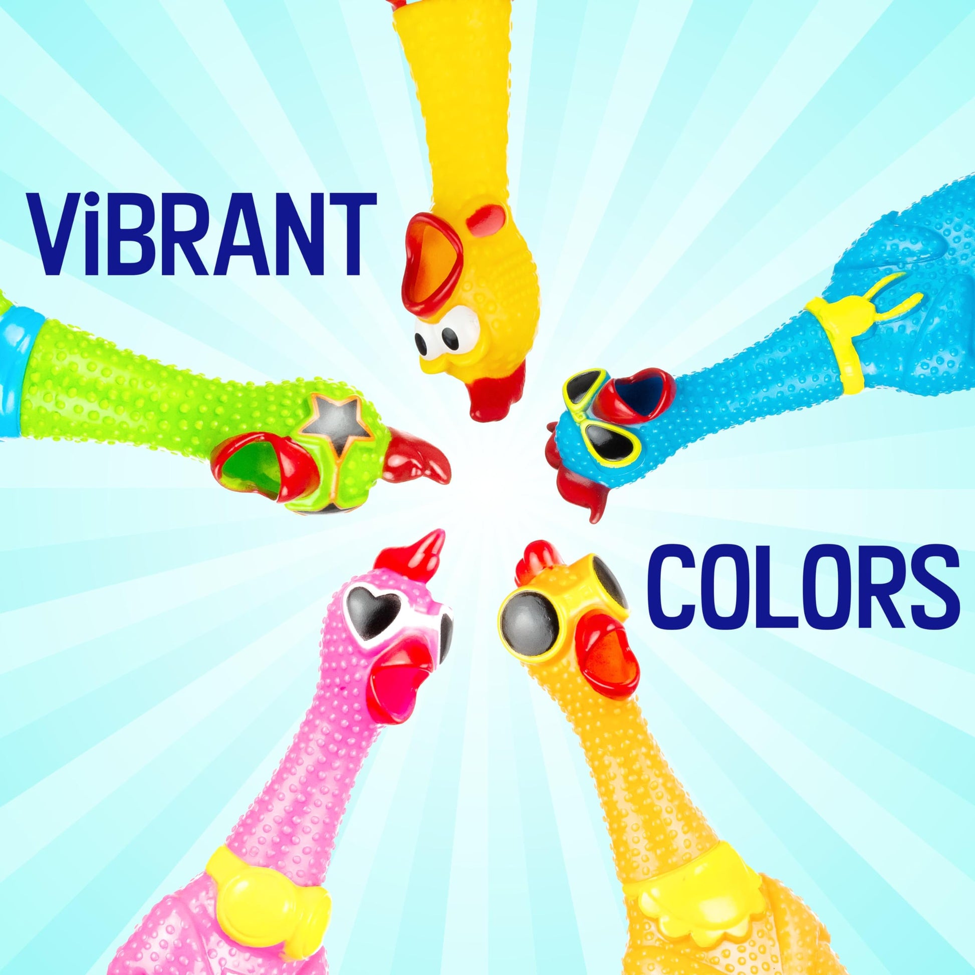 - Silly Screaming Chicken Design - This set includes 3 screaming rubber chickens to squish, squeeze, and play with; each rubber chicken is colorful and wears cool sunglasses, adding a fun twist to a classic toy