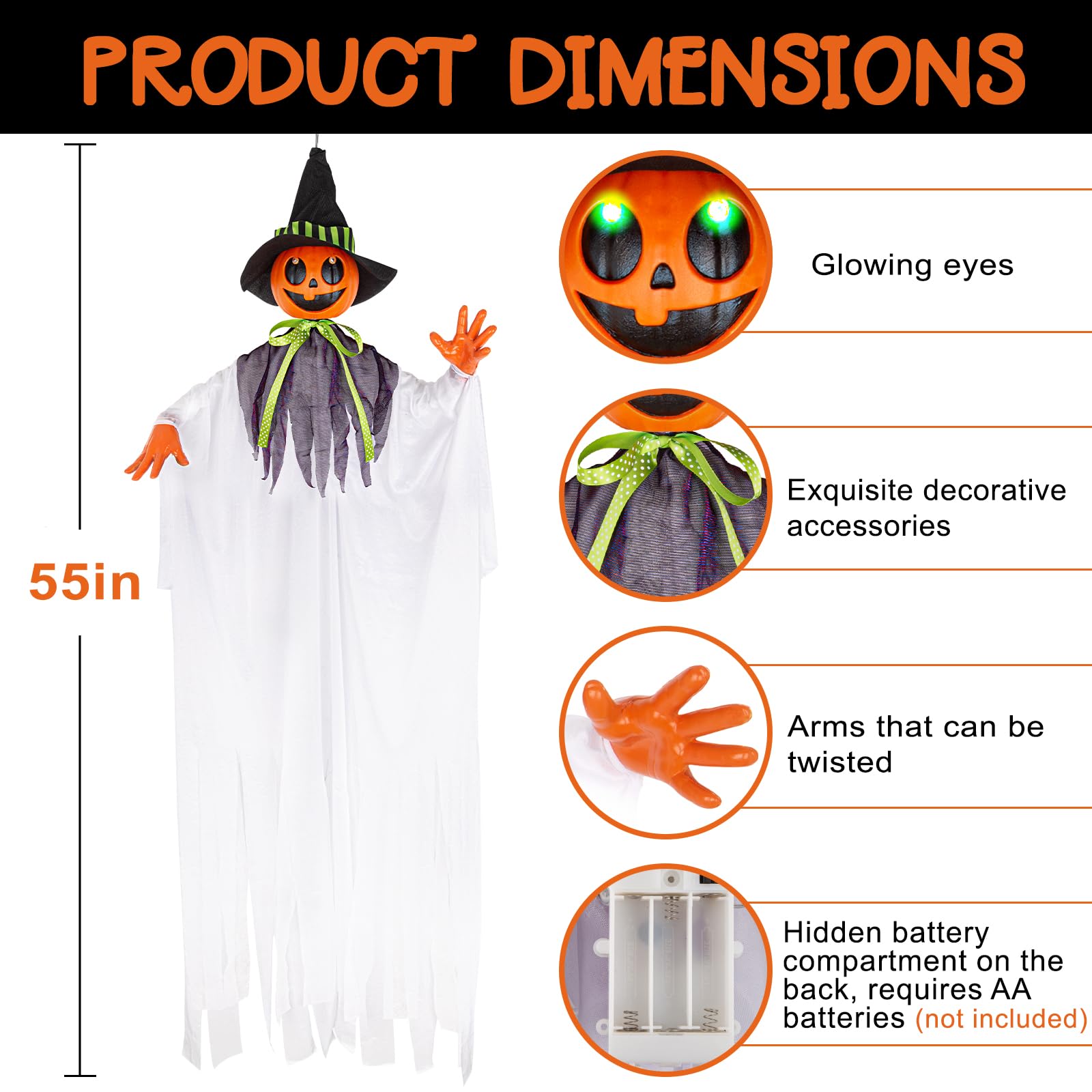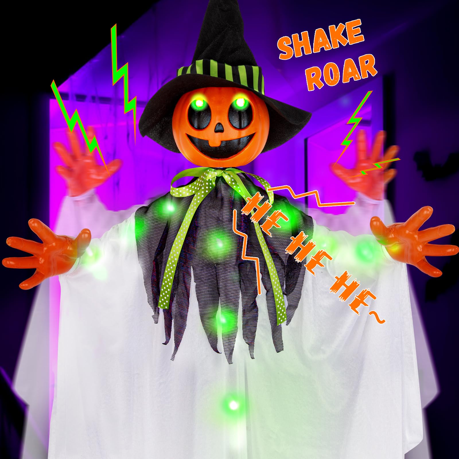 55” Halloween Hanging Animatronics Ghost Pumpkin with LED Lights, Sound & Motion Activated and Shaking Arms - Perfect for Halloween Haunted House Prop Décor, Indoor/Outdoor Display, Lawn, Party