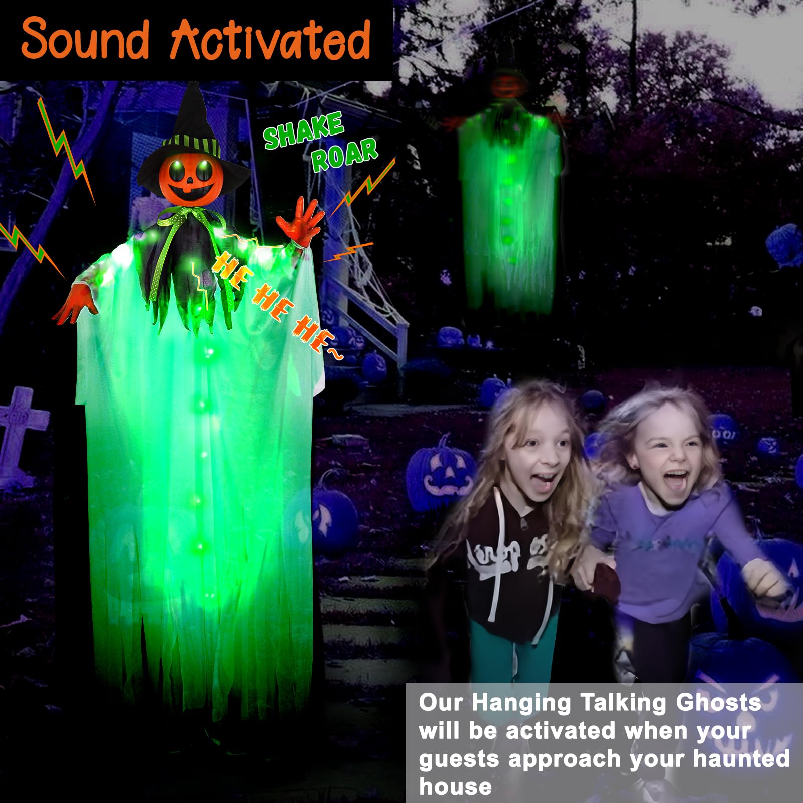 - 【Responsive and Realistic】Watch as this adorable animated pumpkin ghost comes to life, responding to sound activation with haunting glowing glasses, LED lights, and delightful movements. Its realistic shaking arms and playful sounds make it a captivating addition to haunted houses and Halloween parties, whether used indoors or outdoors.