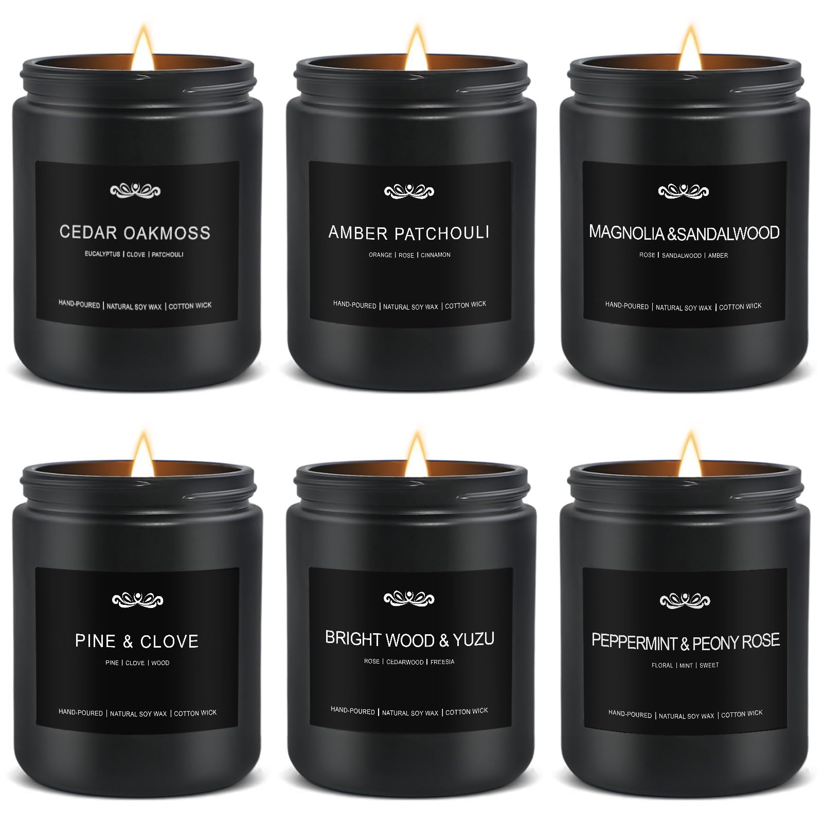 - Men Candles Set: We have carefully blended 6 different fragrance types, Cedar Oakmoss, Amber Patchouli, Magnoli&Sandal Wood, Pine&Clove, Bright Wood &Yuzu,Peppermint&Peonyrose.Each scent is carefully blended by professional perfumers, with rich layers and long-lasting charm, which can bring you a unique olfactory experience.