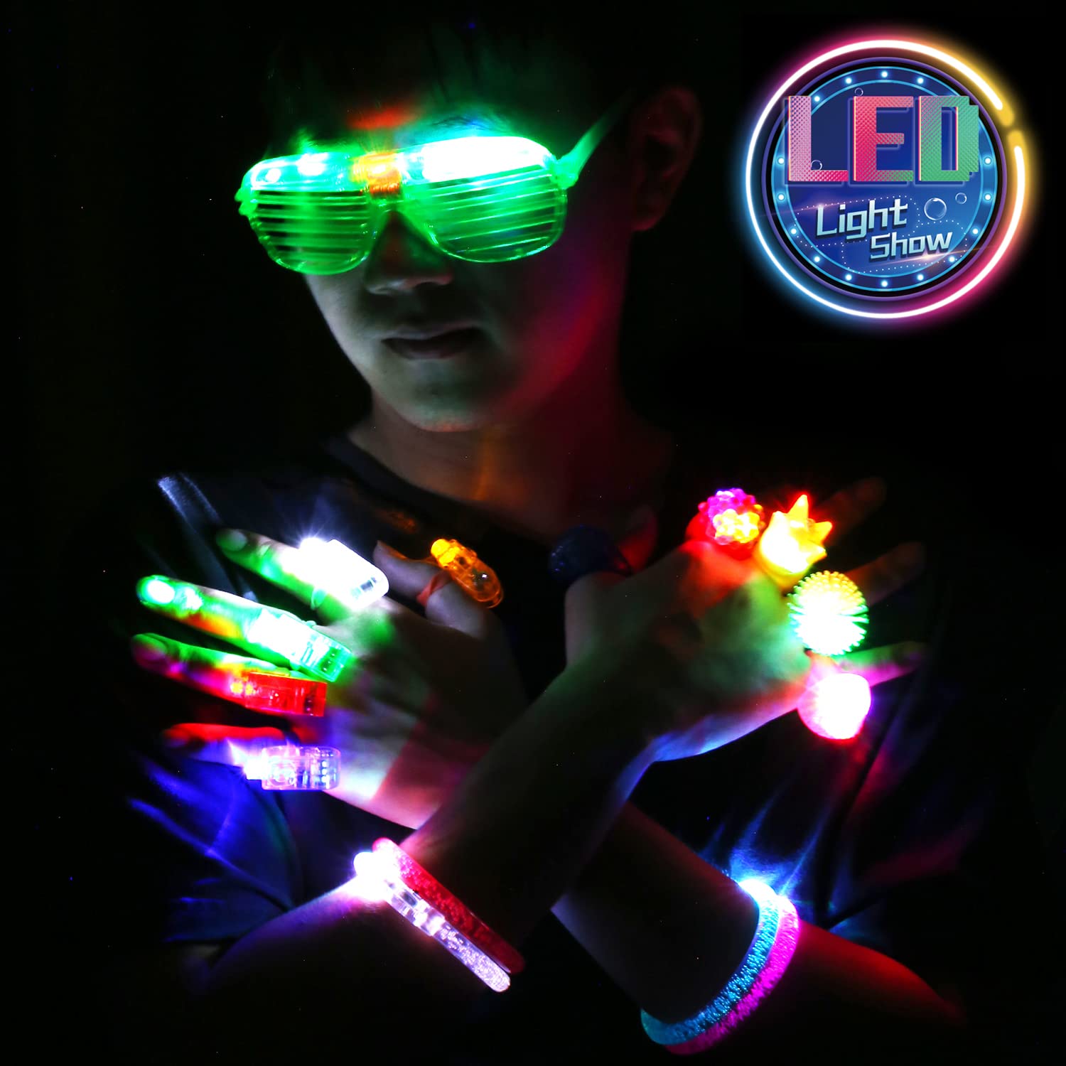 78PCs LED Light Up Toy Party Favors/Supplies Bulk Glow In The Dark For Adult Kids Birthday Halloween With 50 Finger Light, 12 Jelly Ring, 6 Flashing Glasses, 5 Bracelet, 5 Fiber Optic Hair Light