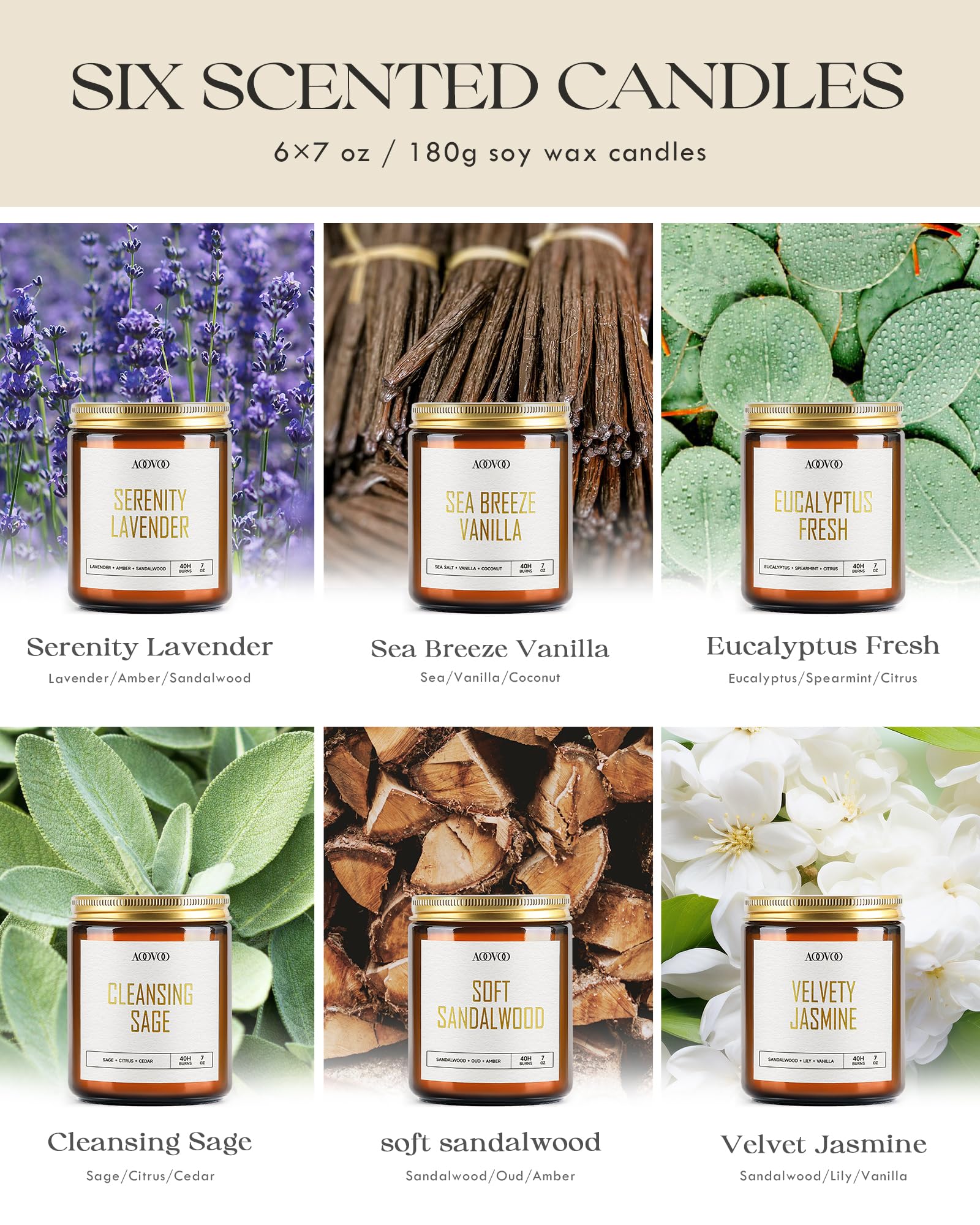 AOOVOO Candles Set - 6PC Scented Candles, Soy Candle, Aromatherapy Candle, Soy Wax Candle, Candle for Home Scented, Lavender/Vanilla/Eucalyptus/Sage/Jasmine/Sandalwood