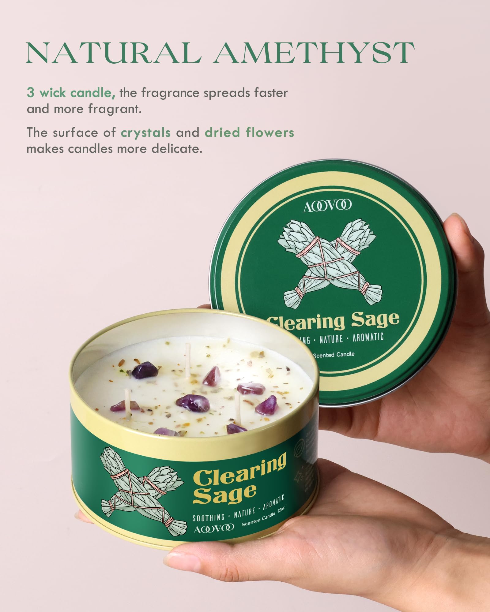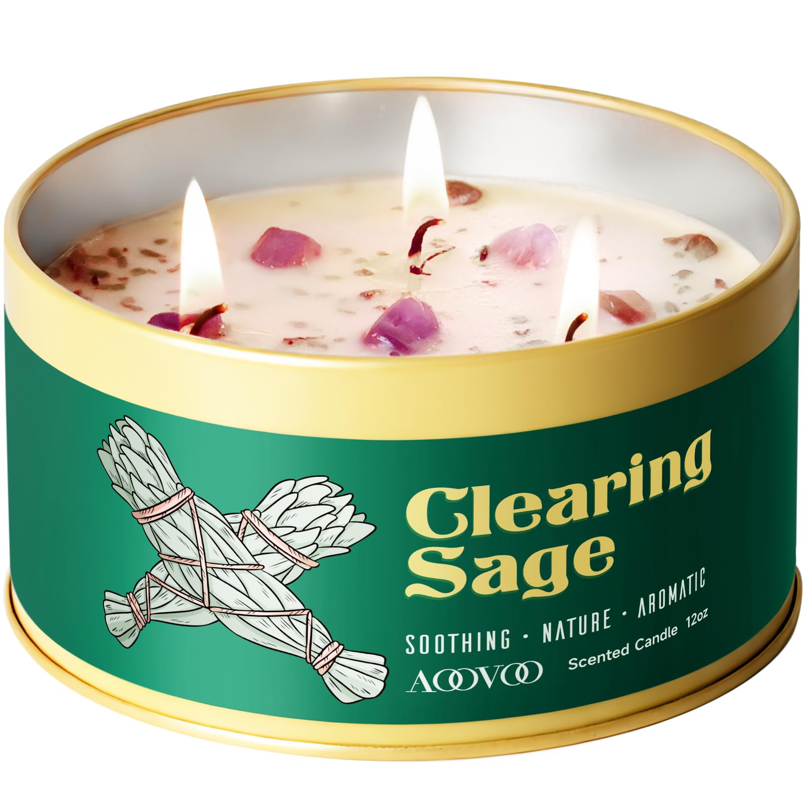 AOOVOO Sage Candle for Cleansing - 3 Wick 12oz Large Scented Candle with Crystals & Sage Leaves Inside, Soy Candles Non Toxic for Meditation Spiritual Gift, Aromatherapy Candle for Women Men