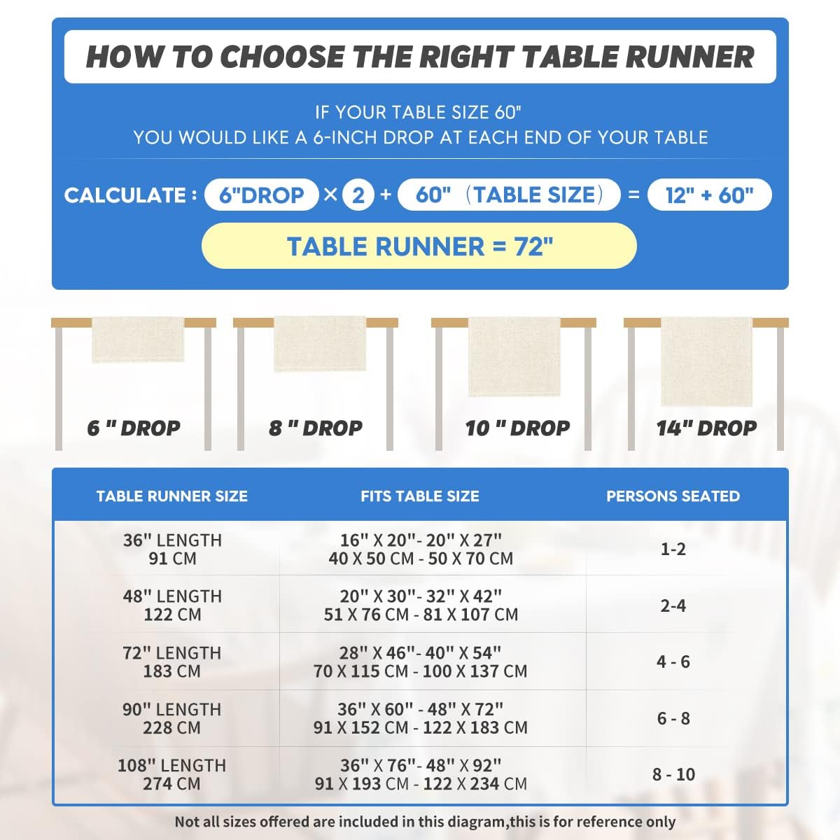 - Fits Table Size : This table runner is 13 x 72 inch, appropriate for a table that can seat 6-8 people, better match your table and give you a delightful dining experience