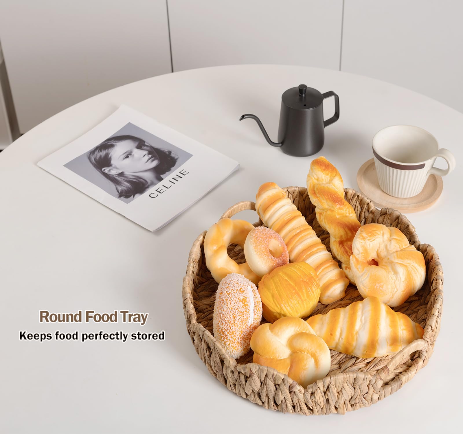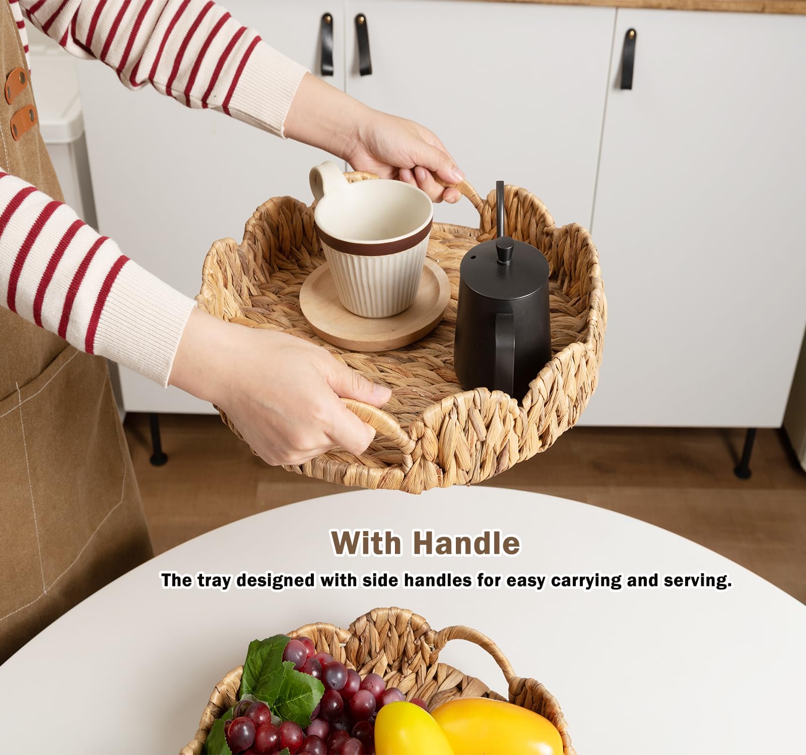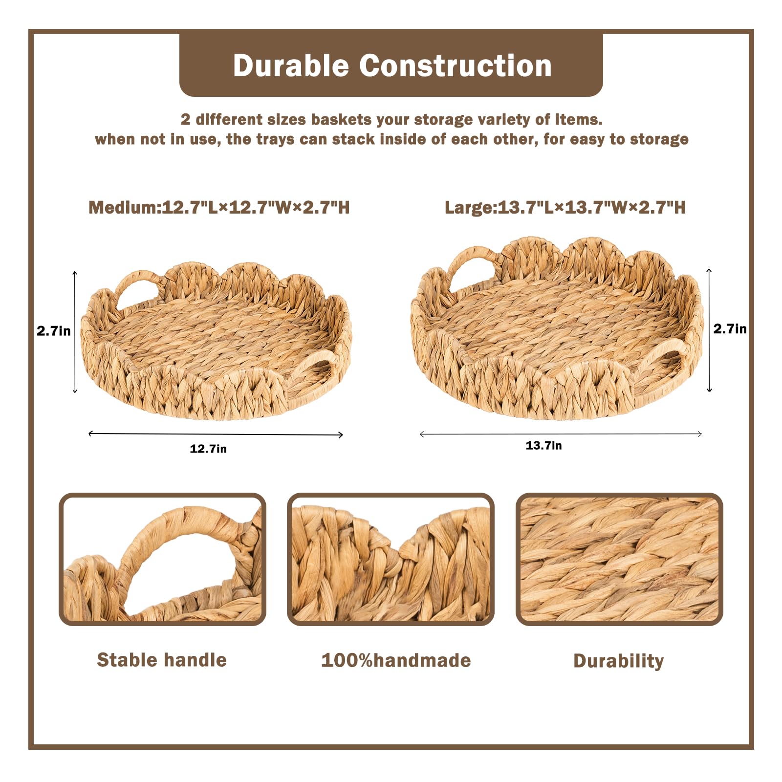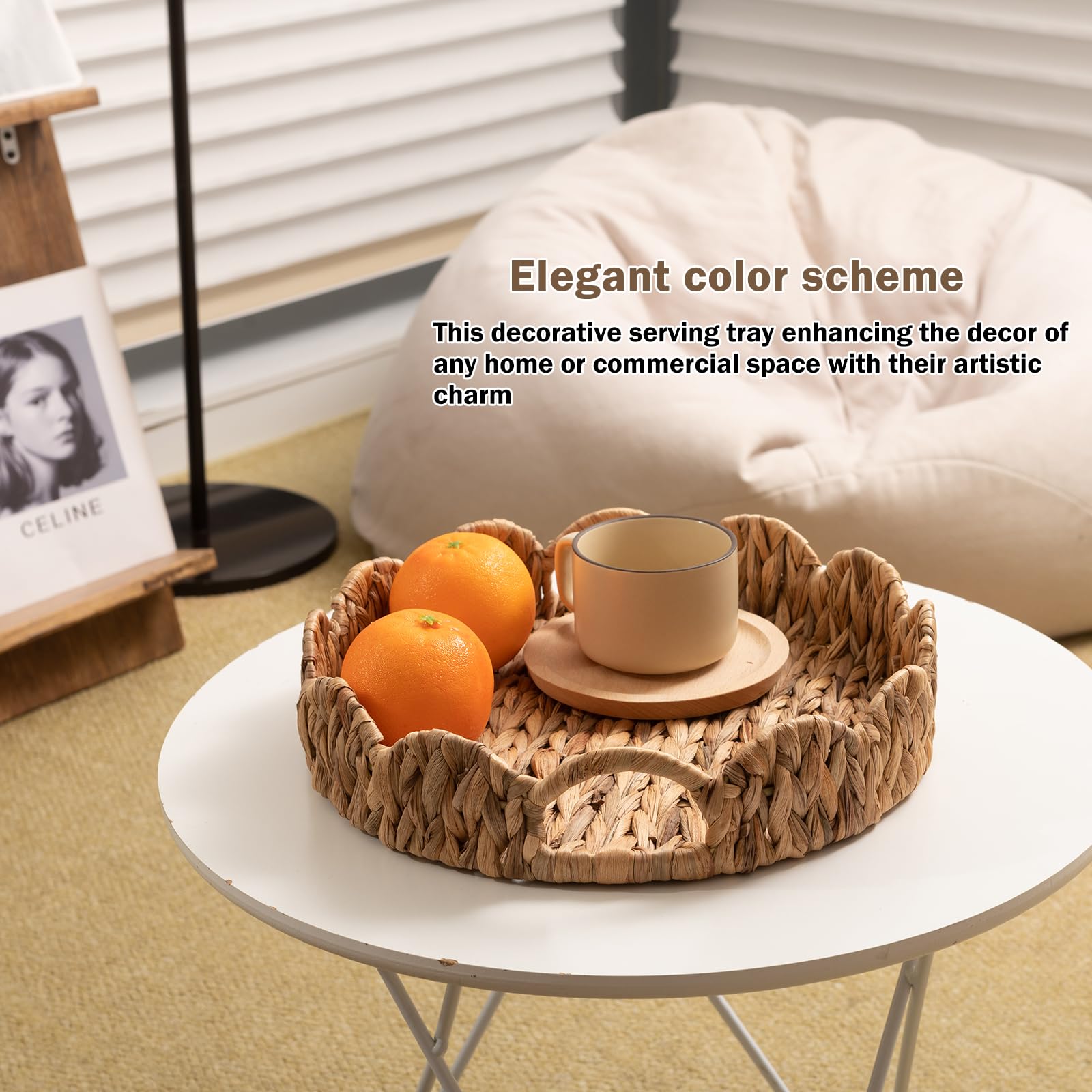 ATEDIR Round Serving Tray, 2-Pack Wicker Basket Tray with Handles, Rattan Woven Decorative Serving Tray, Natural Water Hyacinth Scalloped Tray for Home Decor and Desk Organizer Tray