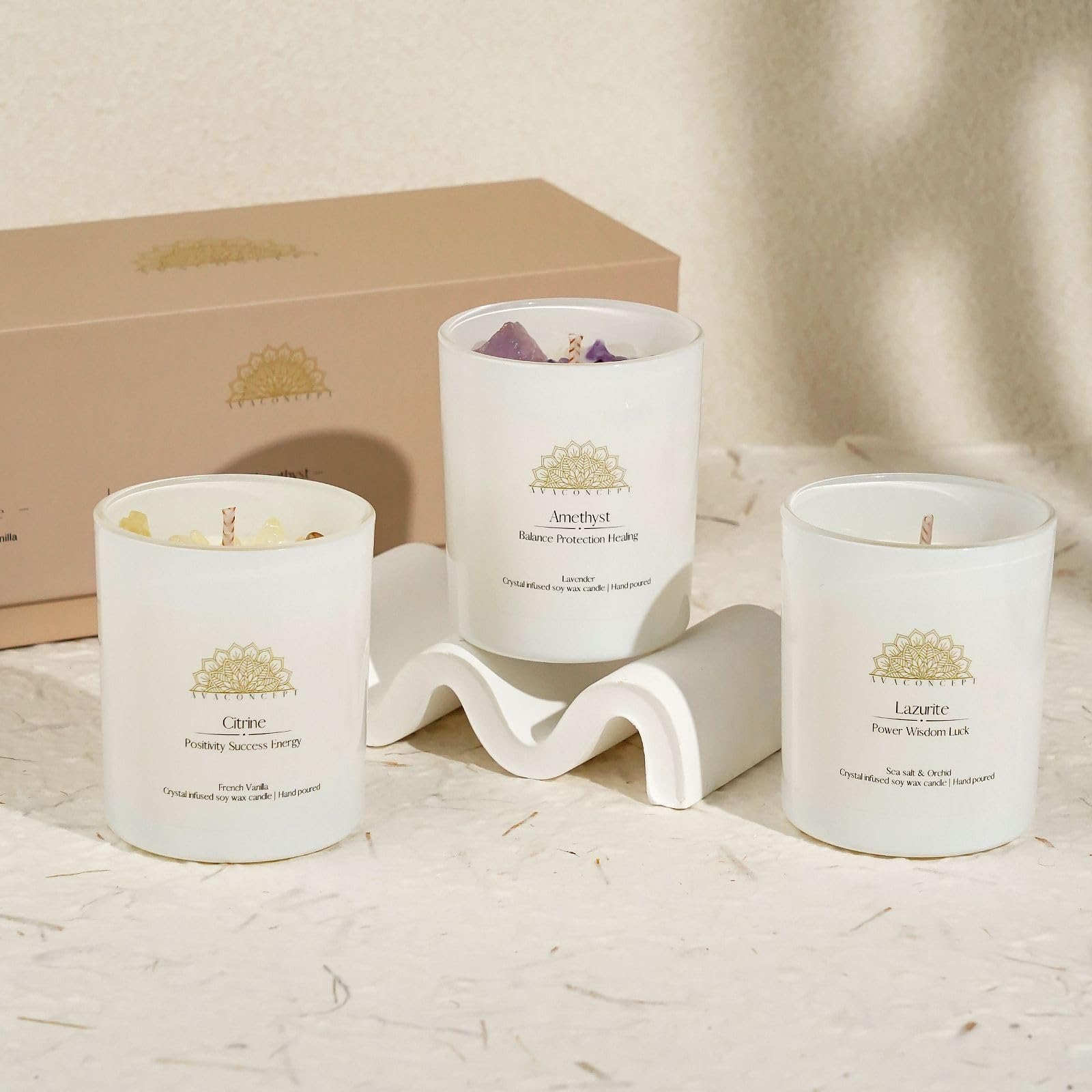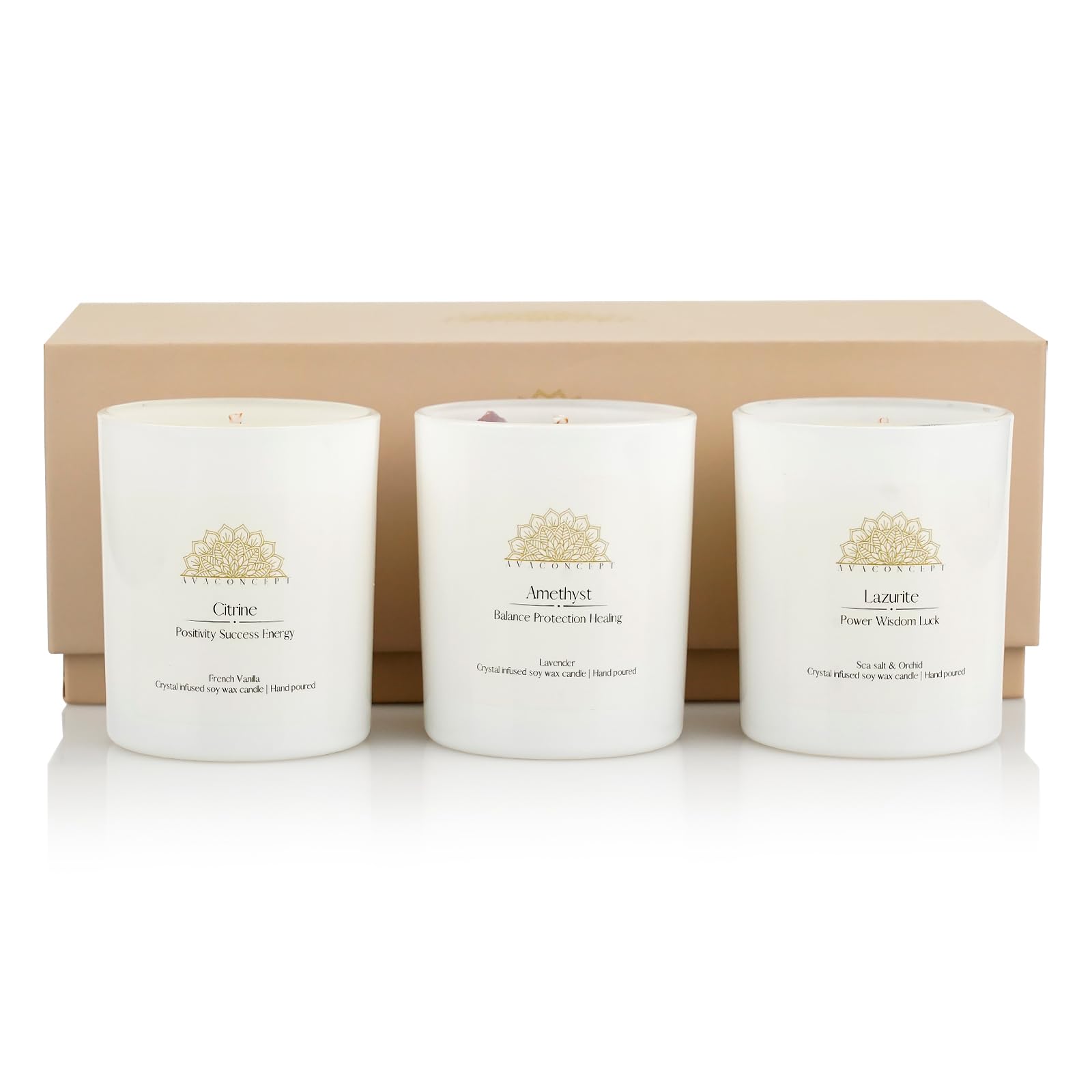 AVA CONCEPT Soy Candles with Healing Crystals. Amethyst, Lazurite, Citrine Crystal. Lavender, Sea Salt & Orchid, French Vanilla. Positivity Energy Gift for Women, 3PC Scented Candle Set 3.5 oz Each