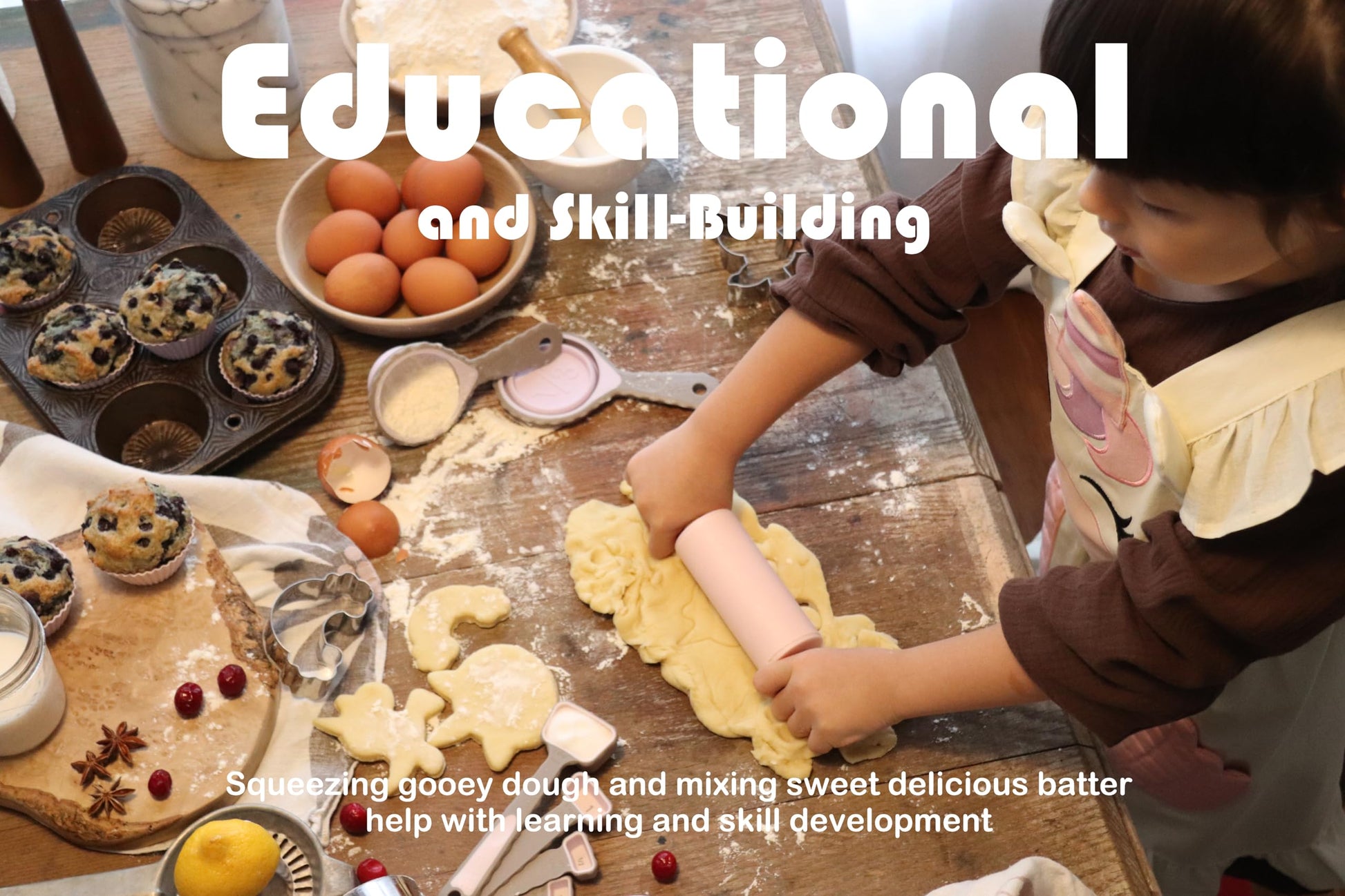 - 🧁 EDUCATIONAL AND SKILL-BUILDING: Squeezing gooey dough and mixing sweet, delicious batter help with learning and skill development. Therefore, we chose materials excellent for facilitating sensory learning. Included are silicone utensils with wooden handles, stainless-steel cookie cutters, working knives in 3 sizes, and collapsible silicone measuring cups.