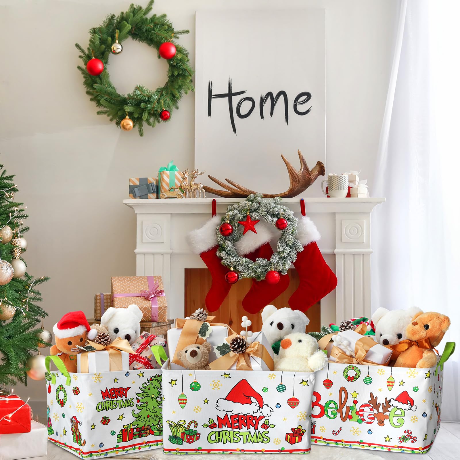 Beeveer 3 Pcs Foldable Christmas Storage Bins with Handle Green Tree Shelf Baskets Fabric Xmas Tree Storage Cube Box for Home Bedroom Office Organizing Closet Gift Baskets