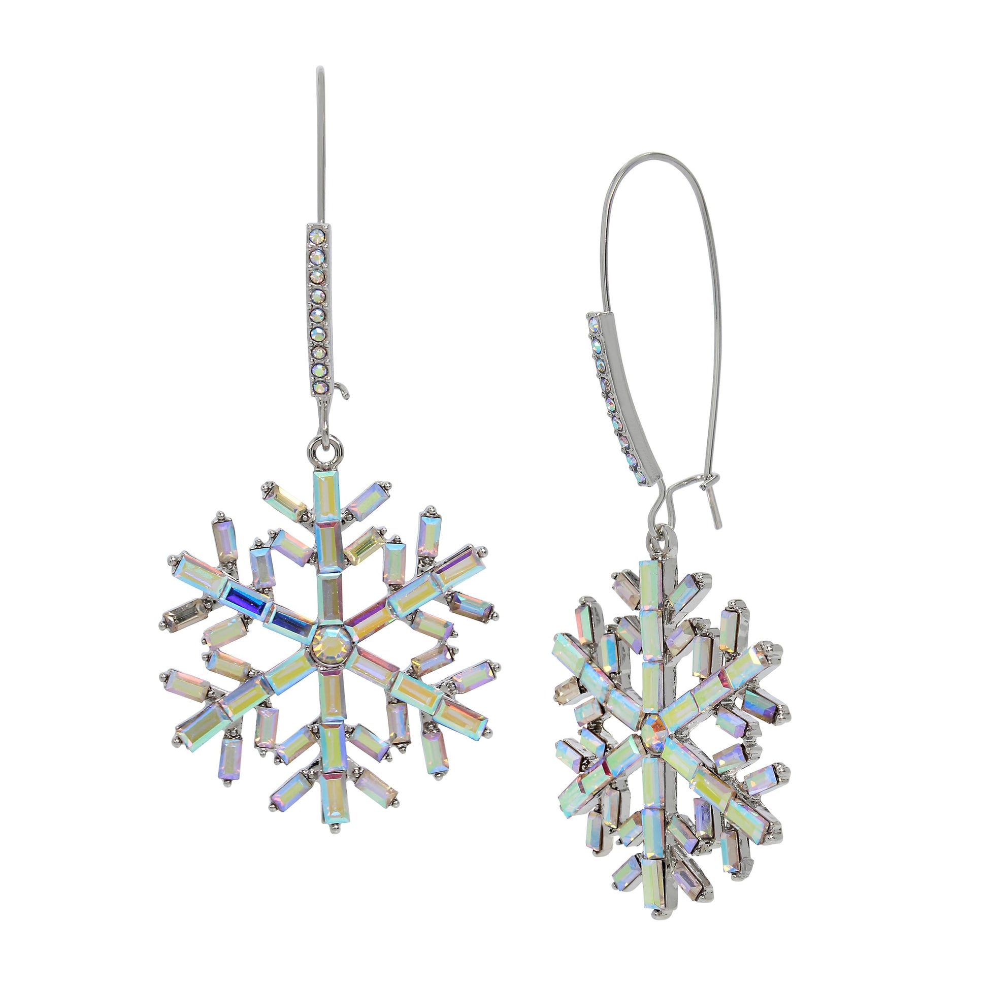 - TRENDY EARRINGS: Dangle earrings featuring elegant long ear wire with delicate stones and glistening baguette gem snowflake. Earrings have a shepherds hook closure. Made from metal and glass.