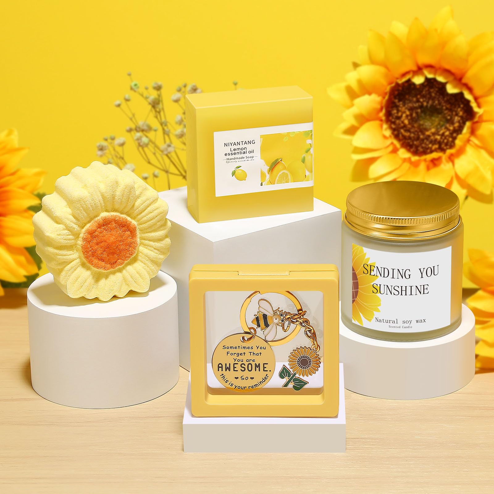 - 【Sunshine in a Box】Spread sunshine and happiness with our sunflower-themed gift basket, thoughtfully crafted to bring joy to her world. This vibrant collection of women's gifts is a radiant symbol of well-being and cheer. This sunflower gift box includes 9 handpicked items, each featuring custom artwork that radiates warmth and affection. Perfect for making her day brighter and more cheerful!
