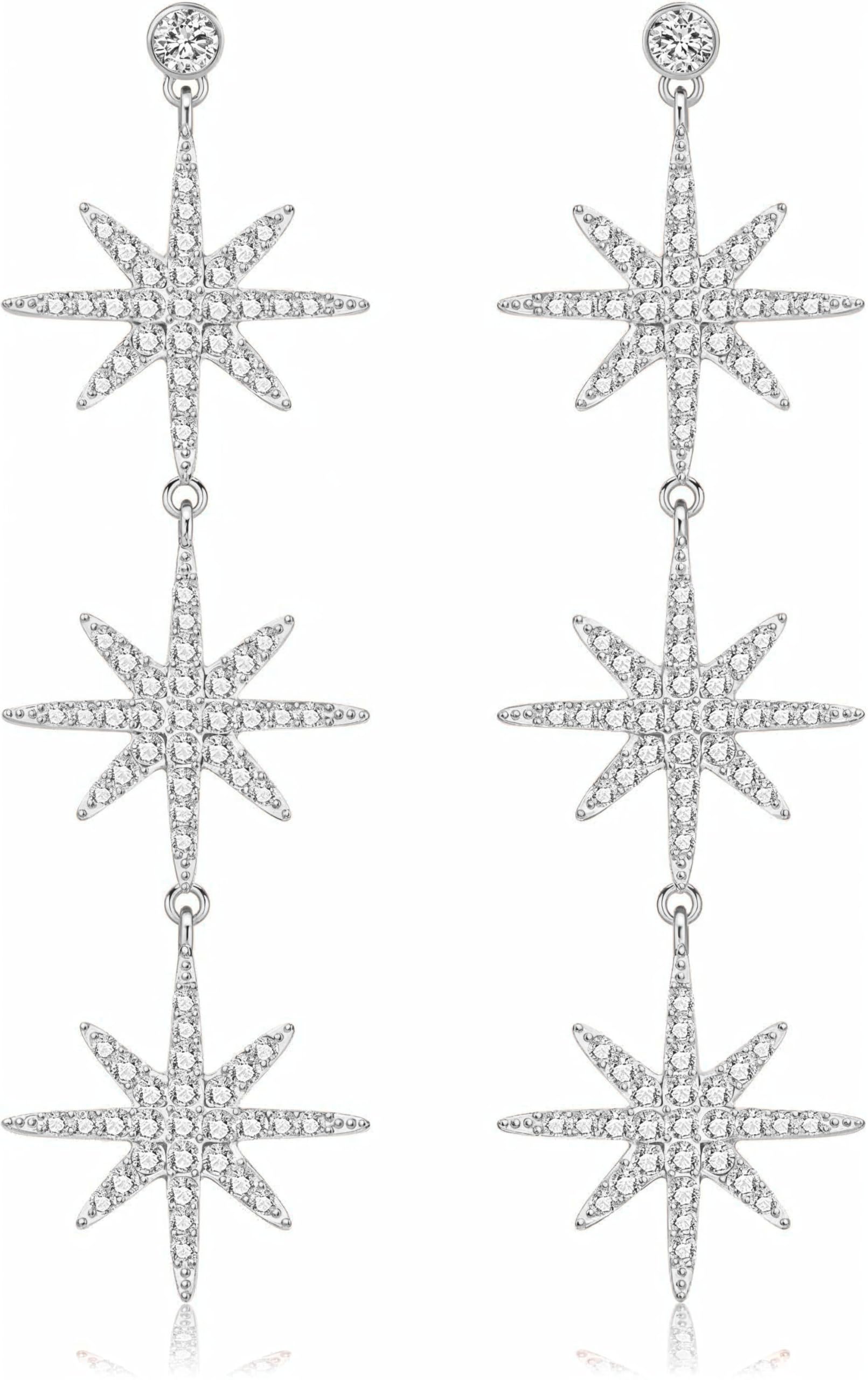 - SPARKLING STAR DESIGN: Crafted from lightweight alloy, these 3.5-inch long silver star earrings feature a dazzling 3-star design adorned with rhinestones. Their elegant style ensures comfort while adding a touch of sparkle to any look.