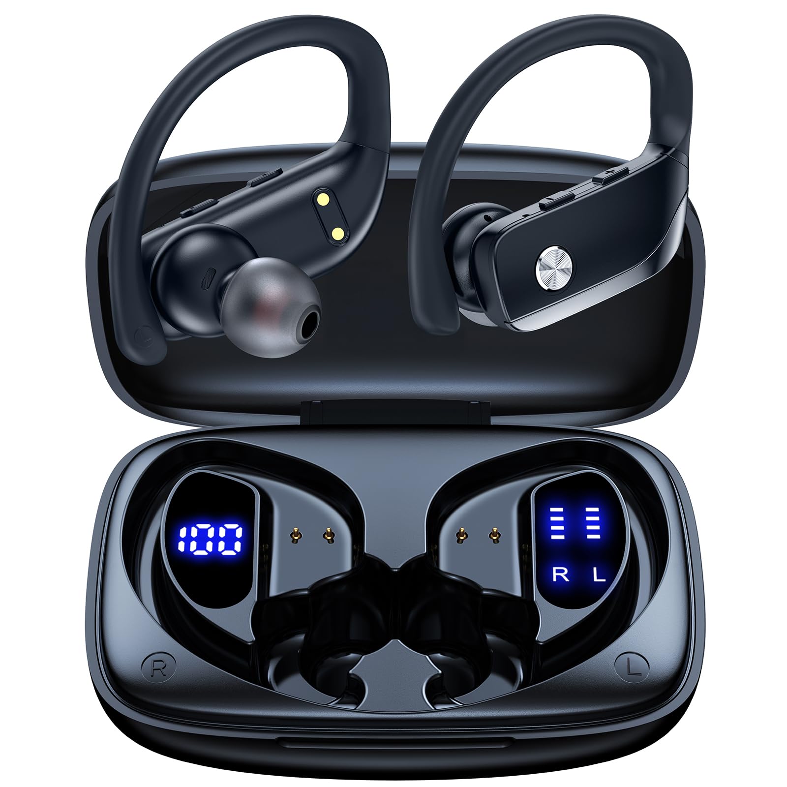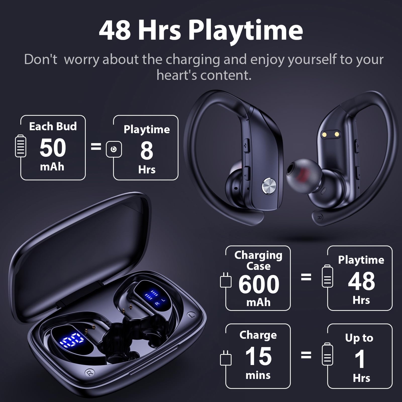 bmanl Wireless Earbuds Bluetooth Headphones 48hrs Play Back Sport Earphones with LED Display Over-Ear Buds with Earhooks Built-in Mic Headset for Workout Black