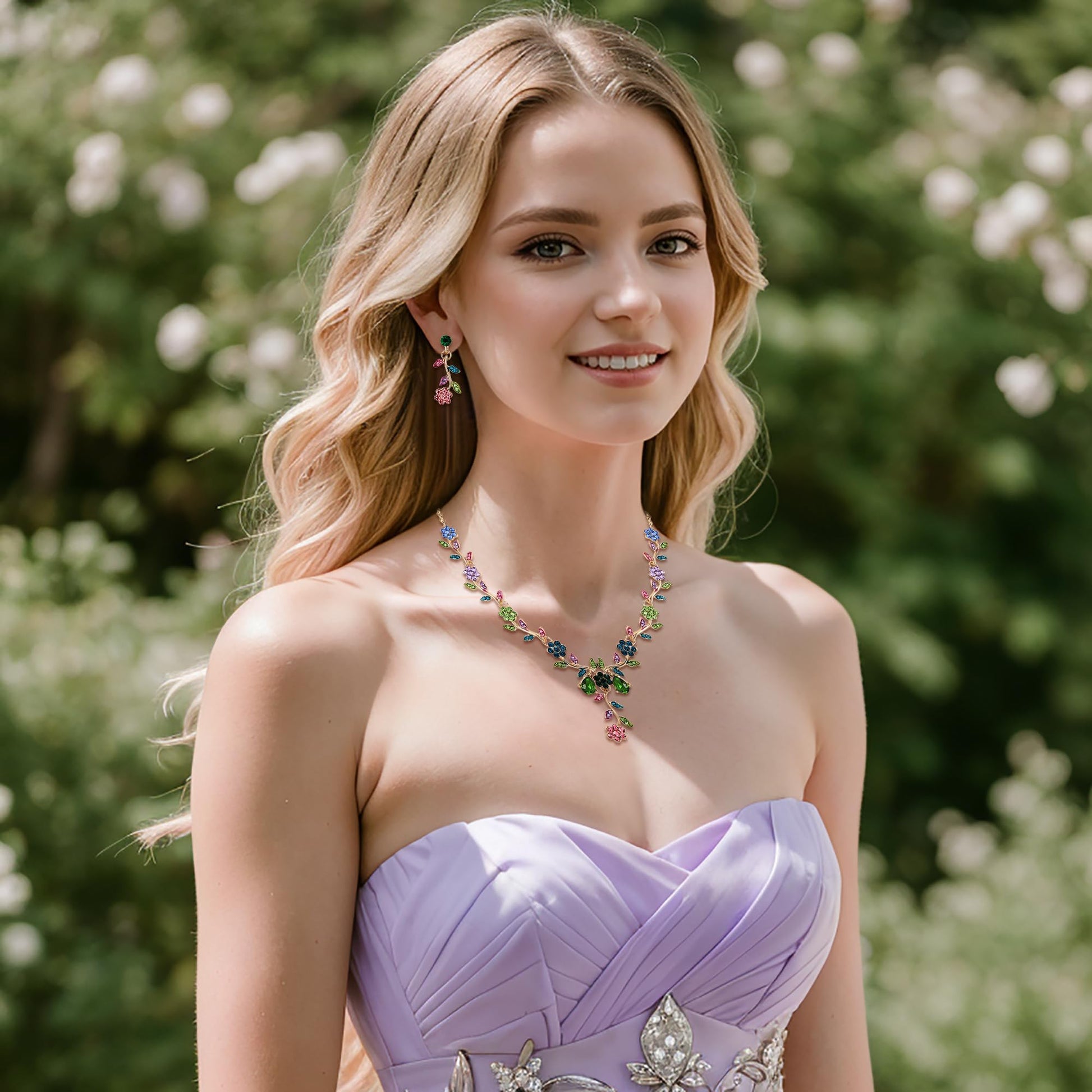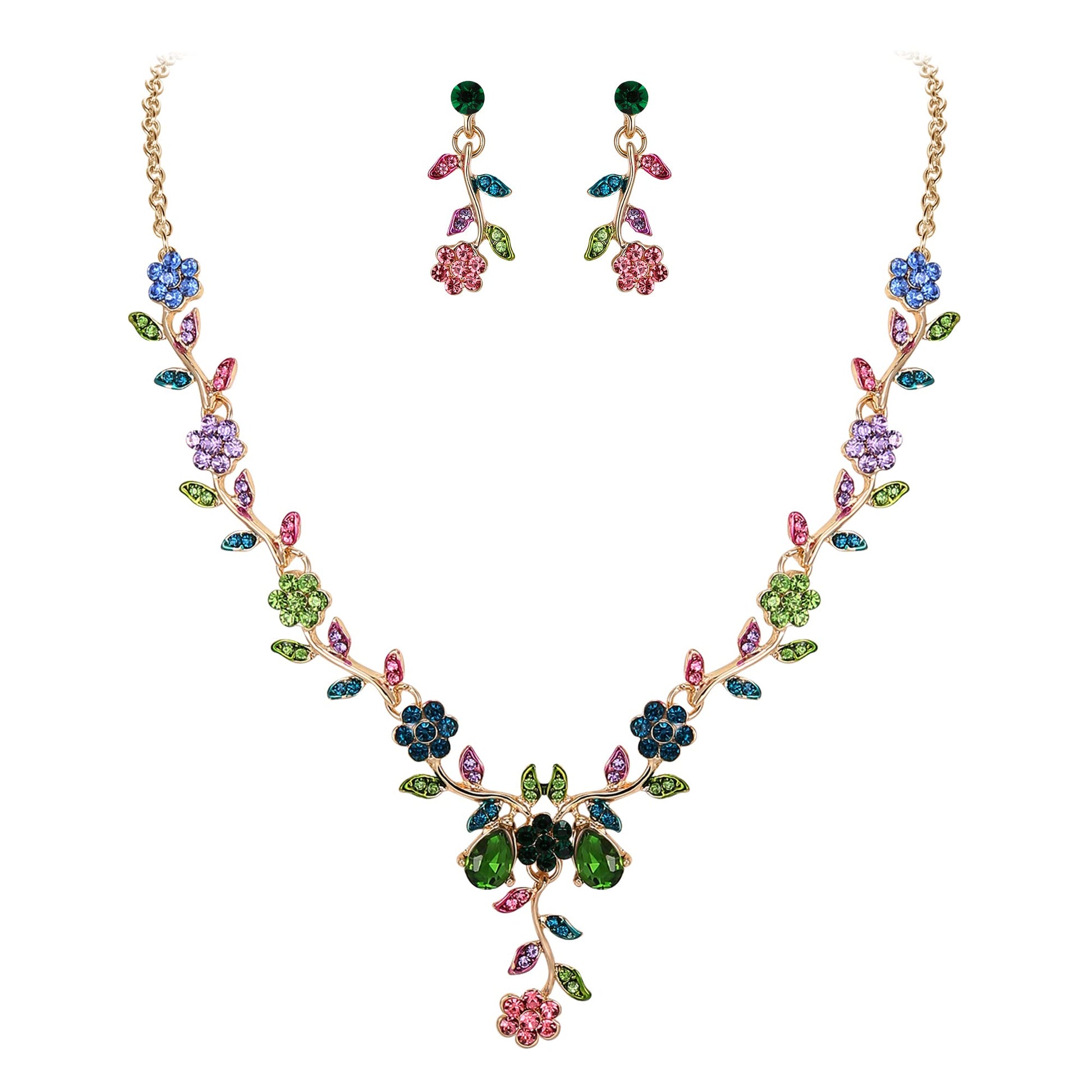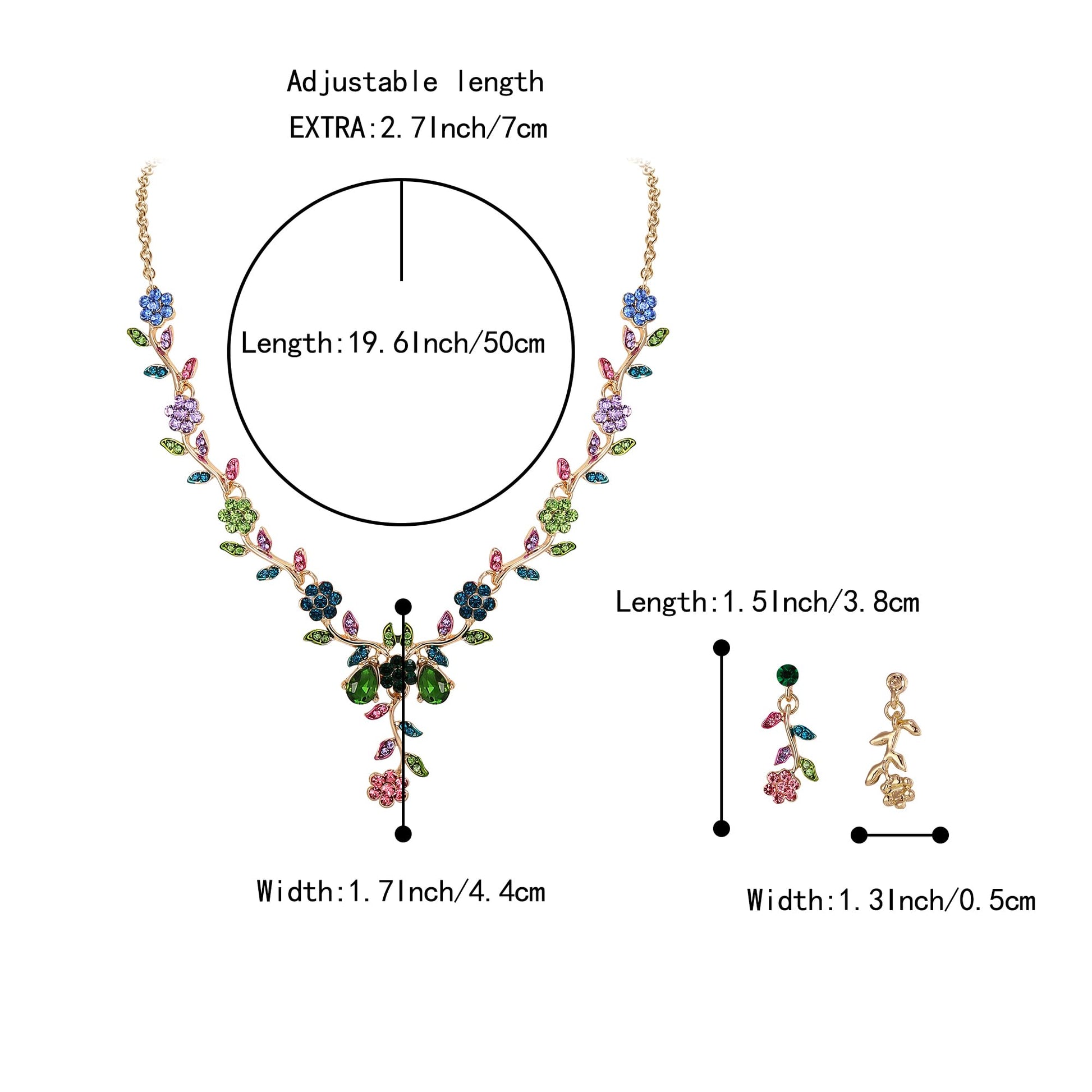 BriLove Women's Wedding Jewelry Leaf Cluster Flower Crystal Dangle Earrings Pendant Necklace Set for Bridal Multi Colour Gold-Tone