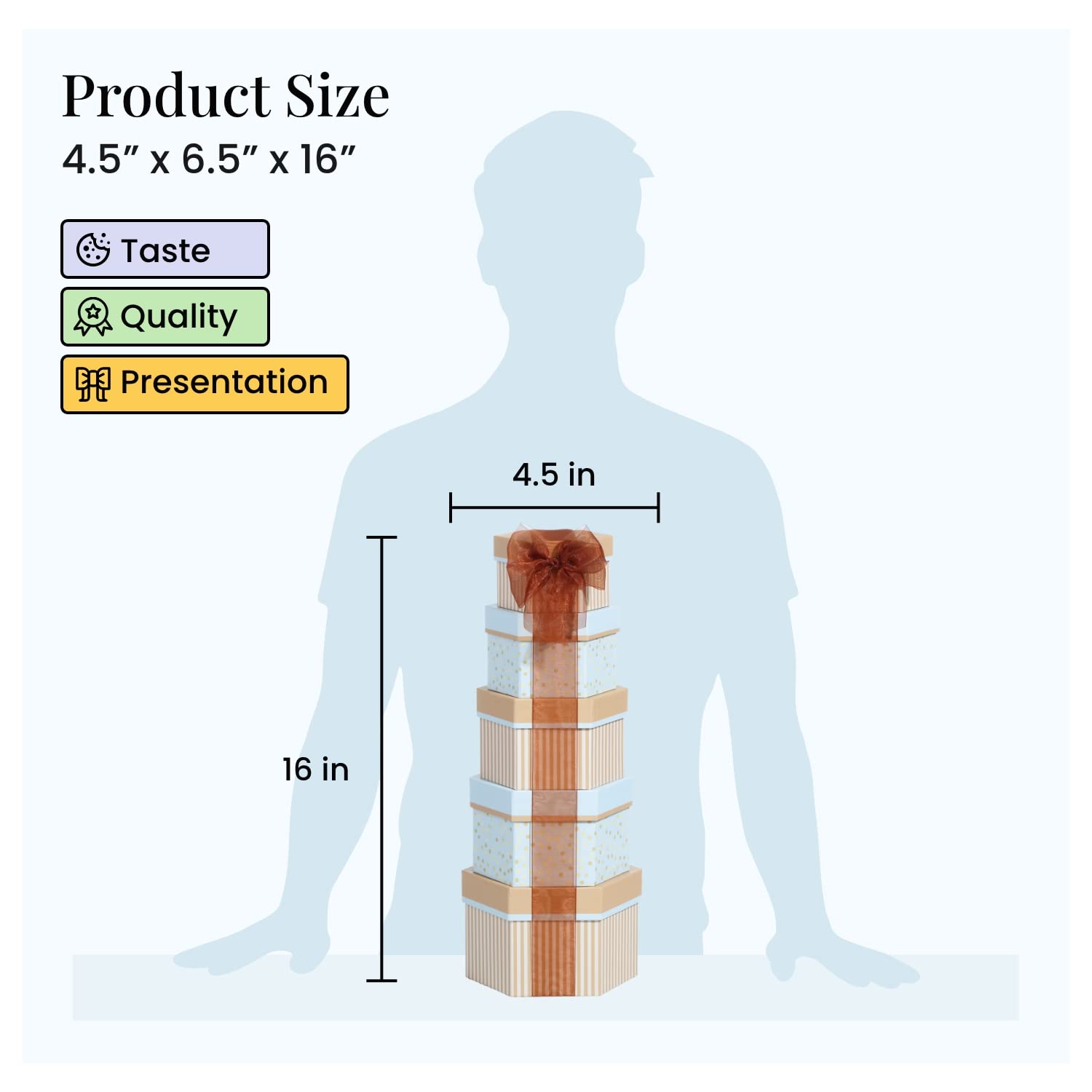 Details: This unique 5 box gift tower comes with a vast assortment of chocolates and goodies. Perfect as a Corporate gift, Birthday gift, or Just because. Gift Includes chocolate chip cappuccino cookies, soft vanilla caramels, gourmet popcorn, sweet & savory snack mix, and so much more!
