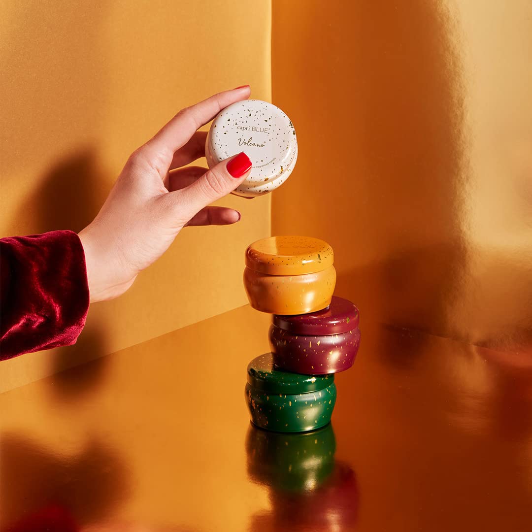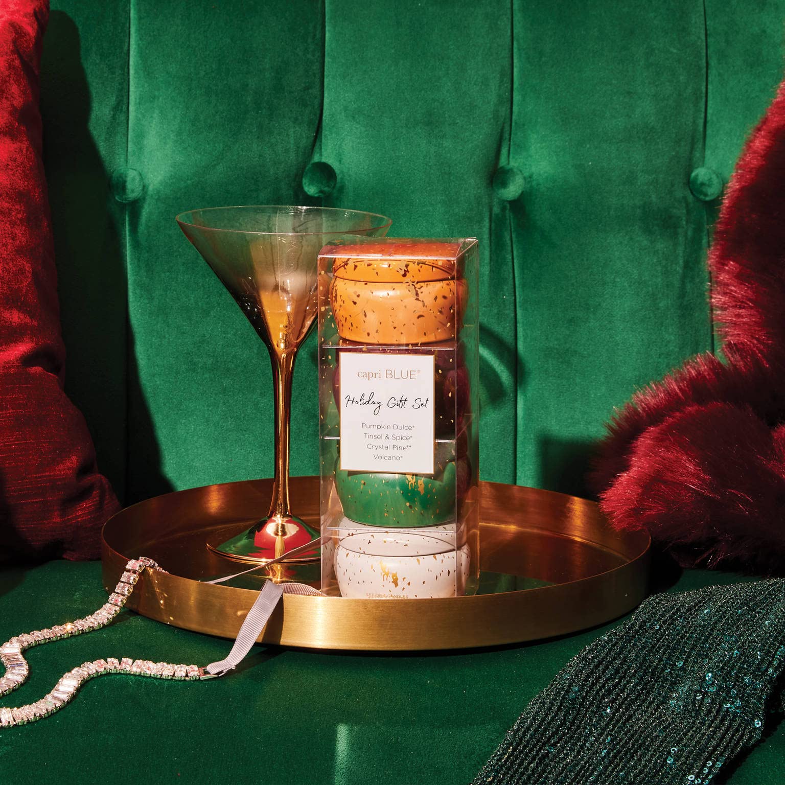 - Capri Blue Glimmer Candle Holiday Gift Set: The best gifts come in small boxes! Features four rich, romantic Glimmer mini tins all stacked in a stunning Glimmer-inspired acetate carton. It truly is the perfect gift. Each gift set comes with one Glimmer Mini Tin in each fragrance: Crystal Pine, Pumpkin Dulce, Tinsel & Spice, and Volcano