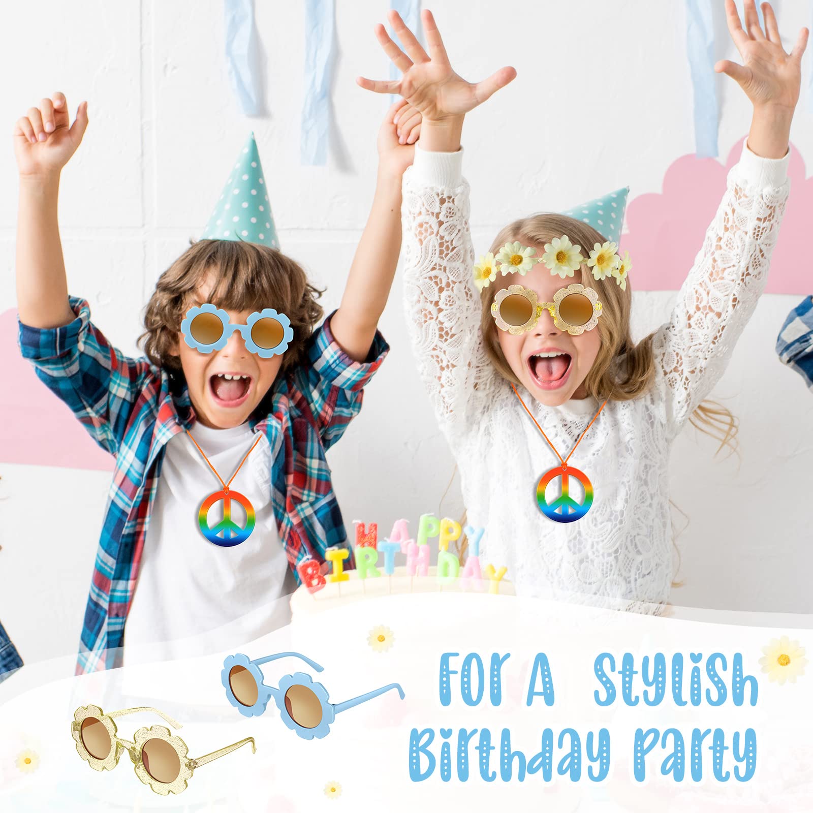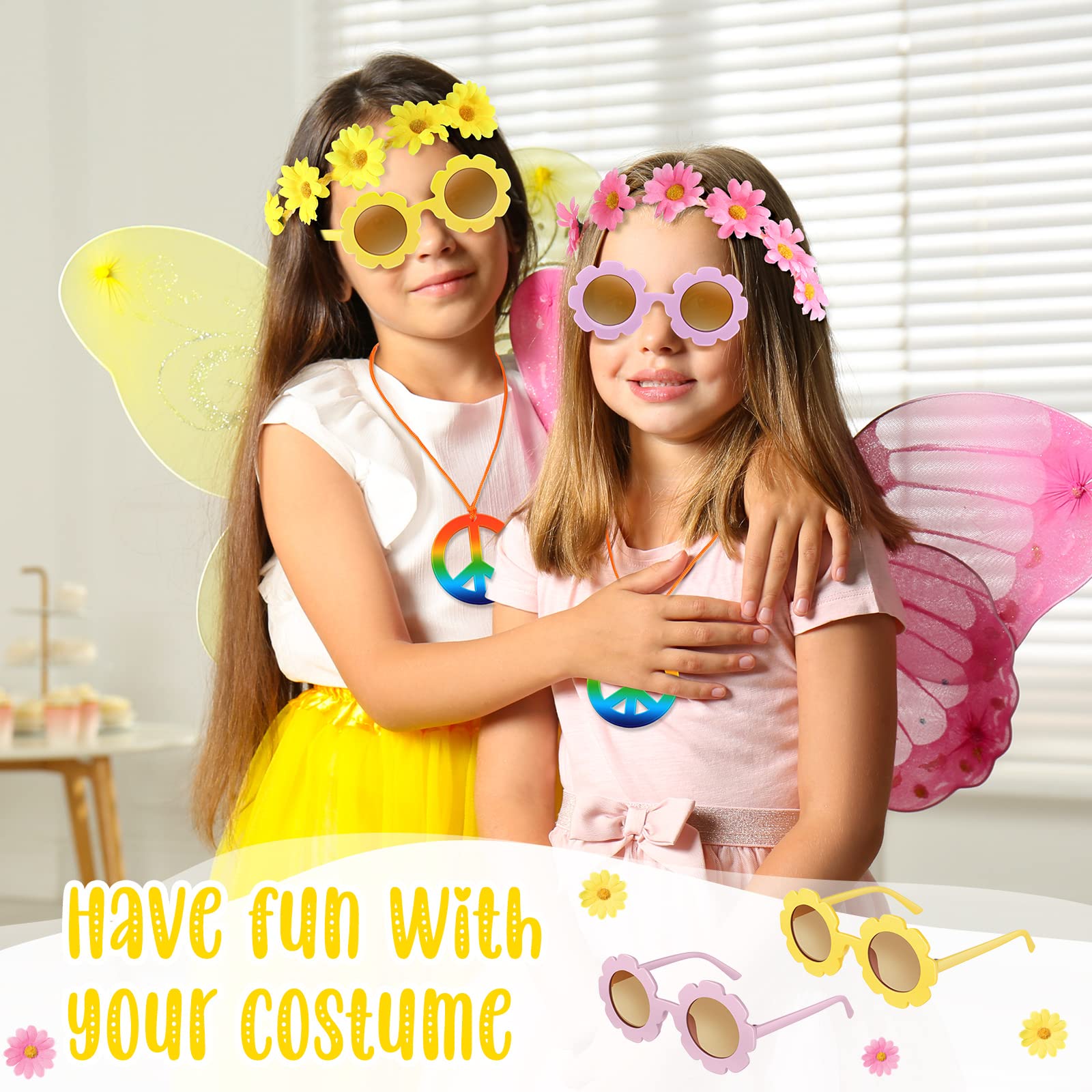 - Groovy Party Favors Set: you will receive 12 pieces of hippie glasses, 12 pieces of dasiy sunflower headbands and 12 pieces of peace sign necklaces; Sufficient quantity and colors meet your daily uses and match, and you can share them with your buddies
