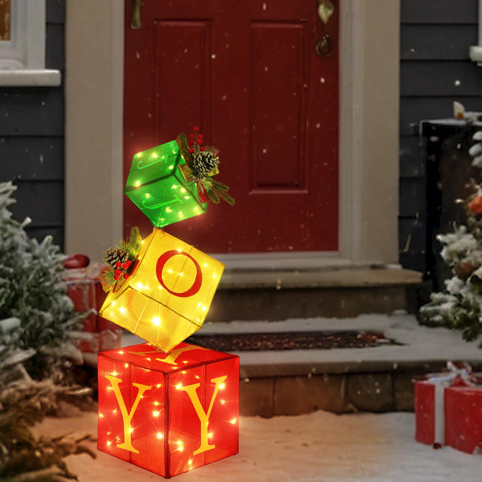 - Easy to Assemble: The lighted gift boxes can be stacked up to 2.6Ft tall. Each box has a hidden round hole and rectangular slot—just match the shapes to stack them securely. (Note: The slots are discreetly designed, so check carefully!)