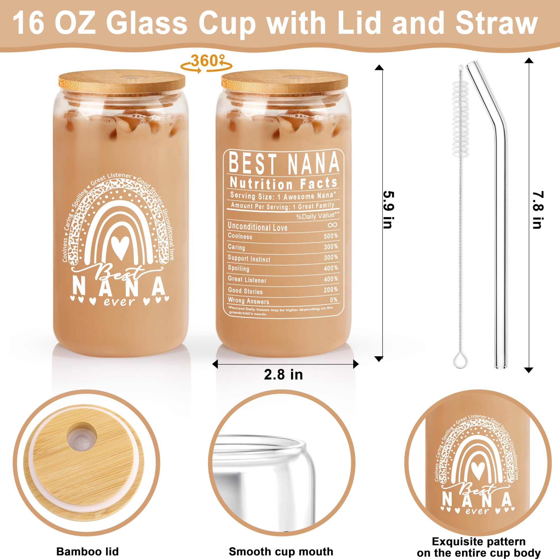 - Gifts Set for Nana: Nana Gifts contain all the well-designed items including Nana Tote bag, Nana makeup bag, natural stone bracelets and Nana cards, 16OZ glass coffee cups and an elegant gift box that is great value for money. There's never a better time to return nana's love for us with a thoughtful gift. These gifts are sure to bring a smile to her face and let her know how much you care