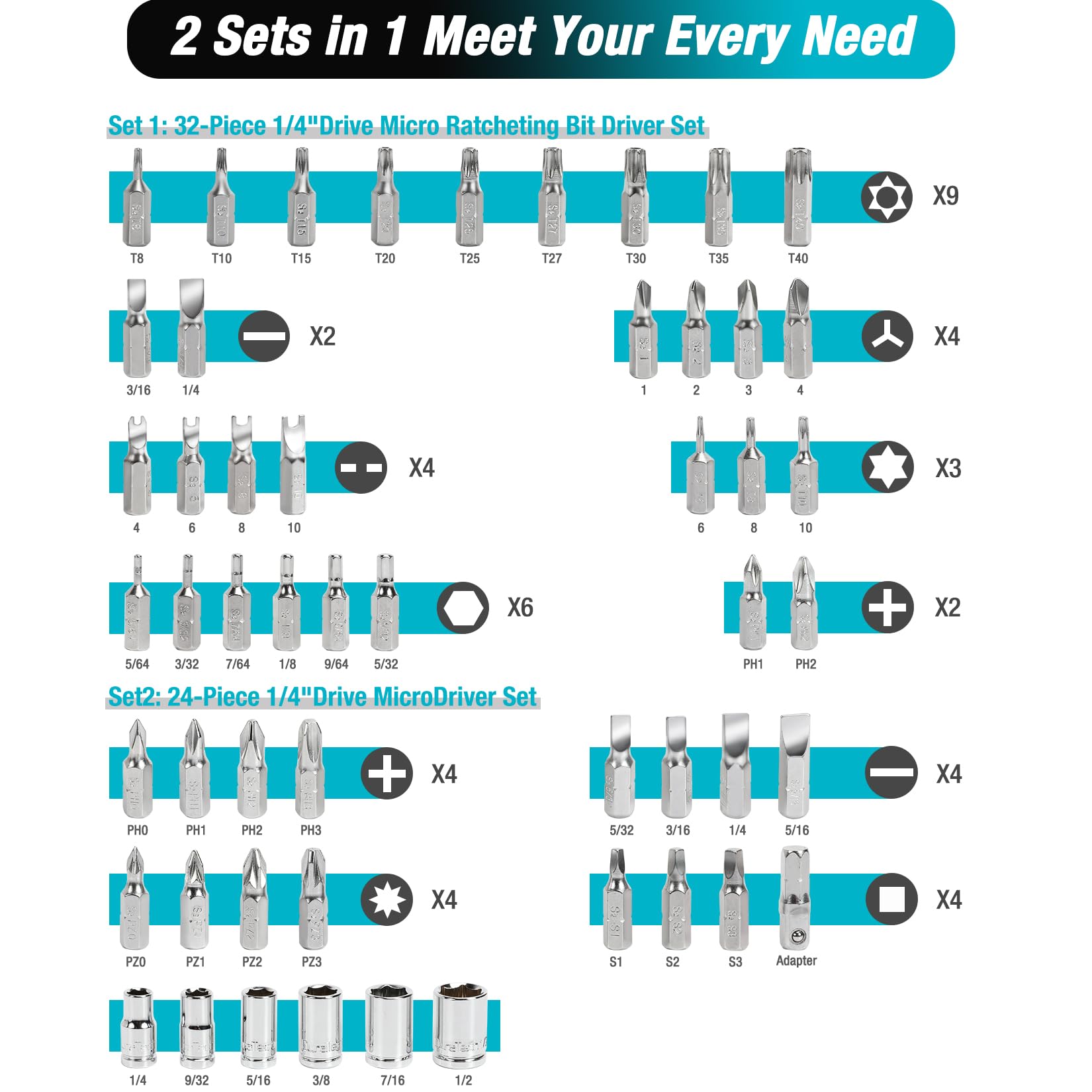 - WHAT YOU GET- This 56pcs versatile set includes 2* 1/4'mini ratchet wrench, 2* bit extension bar, 9* Tamperproof Star(T8, T10, T15, T20, T25, T27, T30, T35, T40), 6* Phillips bits (PHO, PHI, PH2, PH3), 6* Slotted bits(3/16, 1/4, 5/32, 3/16, 1/4, 5/16 in.), 4* Spanner bits, 3* Star Bits, 4* Tri-Wing Bits, 6* Hex Bits (5/64, 3/32, 7/64, 1/8, 9/64, 5/32-in.), 4* Pozi bits (PZO, PZ1, PZ2, PZ3), 3* Square bits(S1, S2, S3), 1* Adapter and 6* Sockets(1/4, 9/32, 5/16, 3/8, 7/16, 1/2-in)