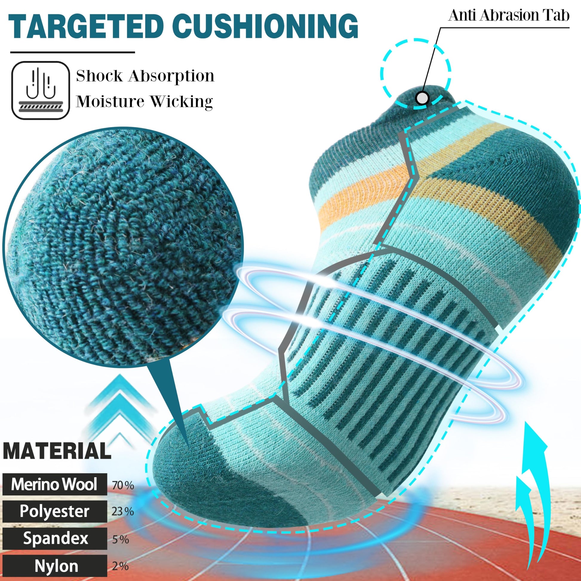 - SELECTED MATERIAL - These hiking ankle socks for women & men are made of 70% MERINO WOOL, 23% polyester, 5% spandex , 2% nylon. They can keep the temperature and warm up your feet in cold weather. And the premium merino wool has great odor resistant property.