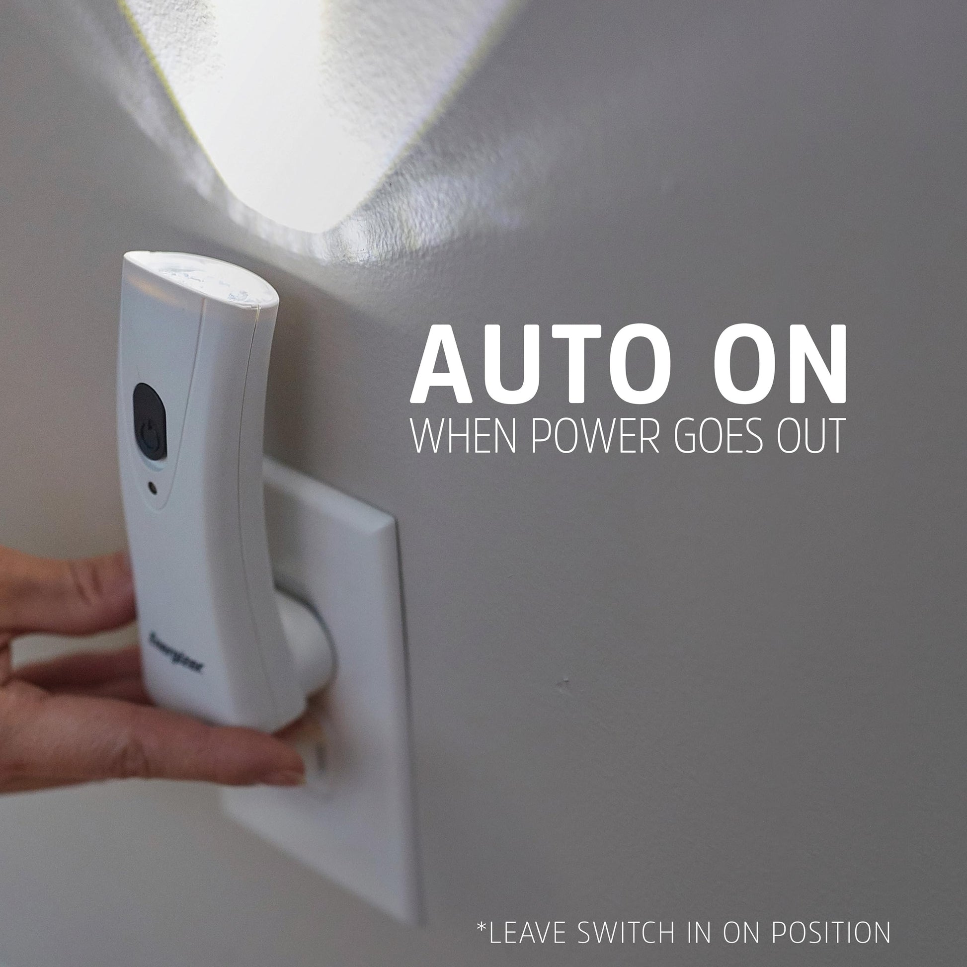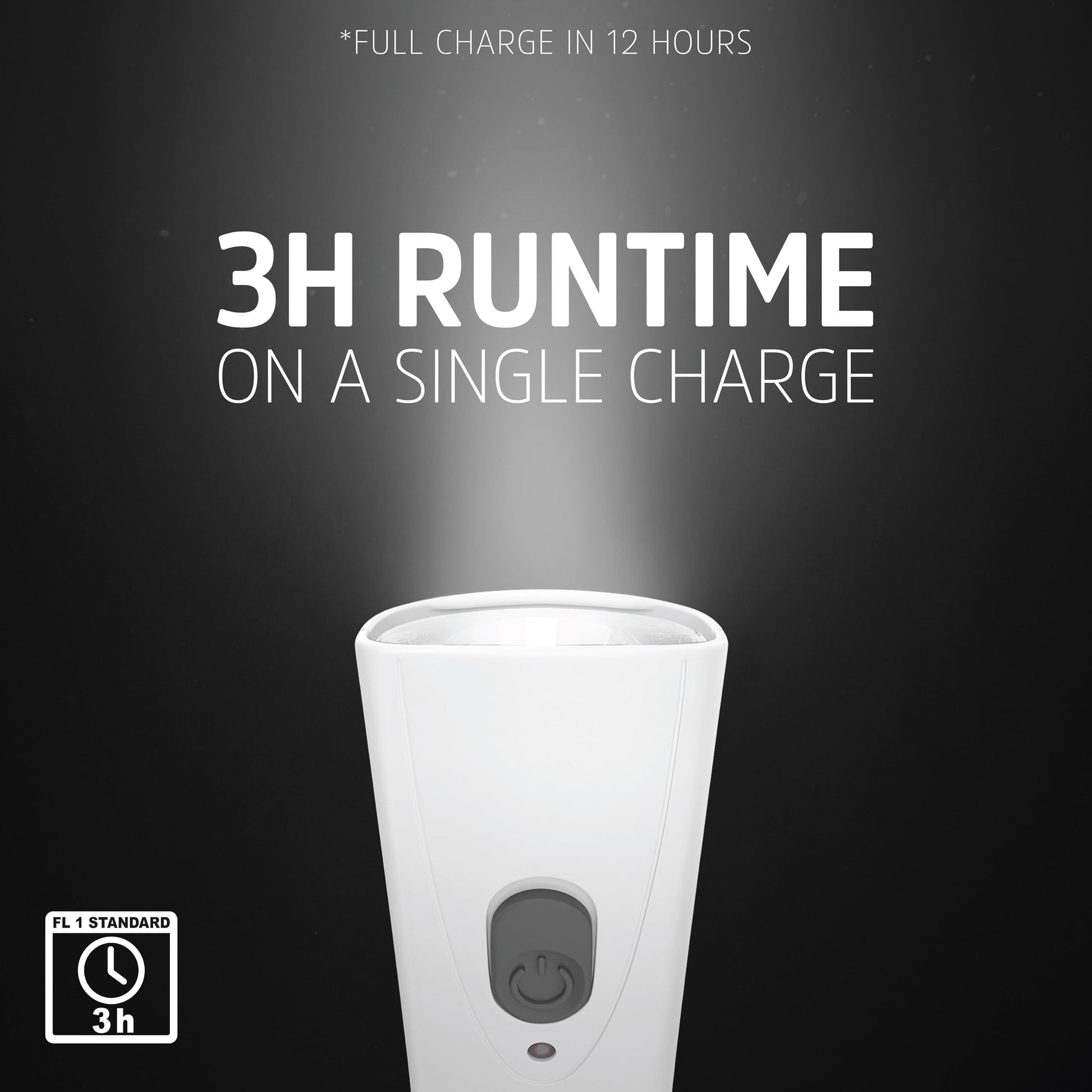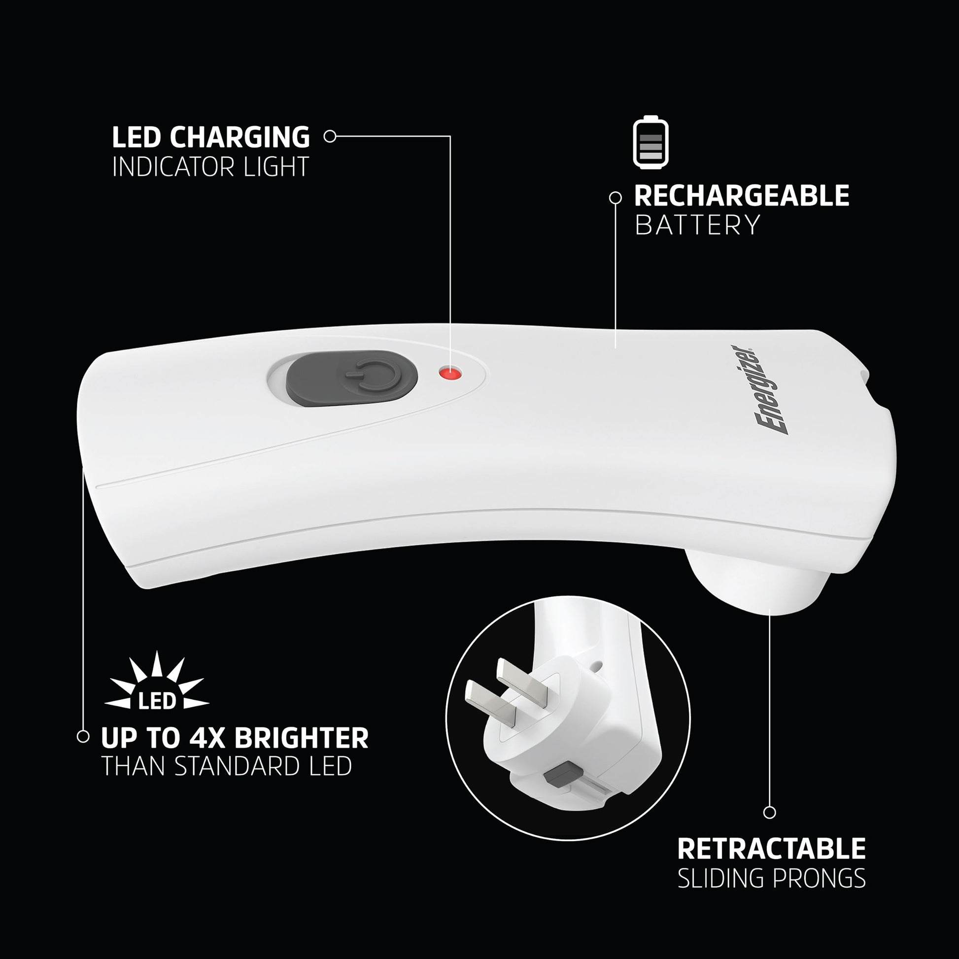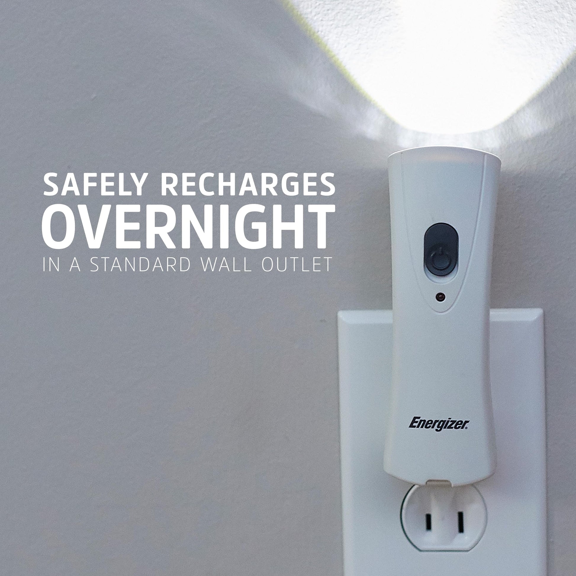 Details: Energizer Weatheready Rechargeable Compact Handheld Light helps you prepare for power outages with a rechargeable plug-in design. Designed for emergency situations, this rechargeable LED light features a built-in rechargeable battery and plugs into the wall so it's always charged and ready to help keep your family safe. This emergency flashlight is up to 4x brighter than standard LED technology and illuminates objects up to 30 meters away to give you the brightness you need when the lights go out. A retractable AC plug goes directly into any standard electrical outlet and folds out of the way while you use this Energizer flashlight. It charges overnight to provide 3 hours of runtime, and it has a red LED charging indicator that lights up to show you when this flashlight is charging. Leave the switch in the on position while it charges so the compact flashlight turns on automatically when the power goes out, making it easy to find and convert into a handheld flashlight. No batteries to replace, always ready to shine.