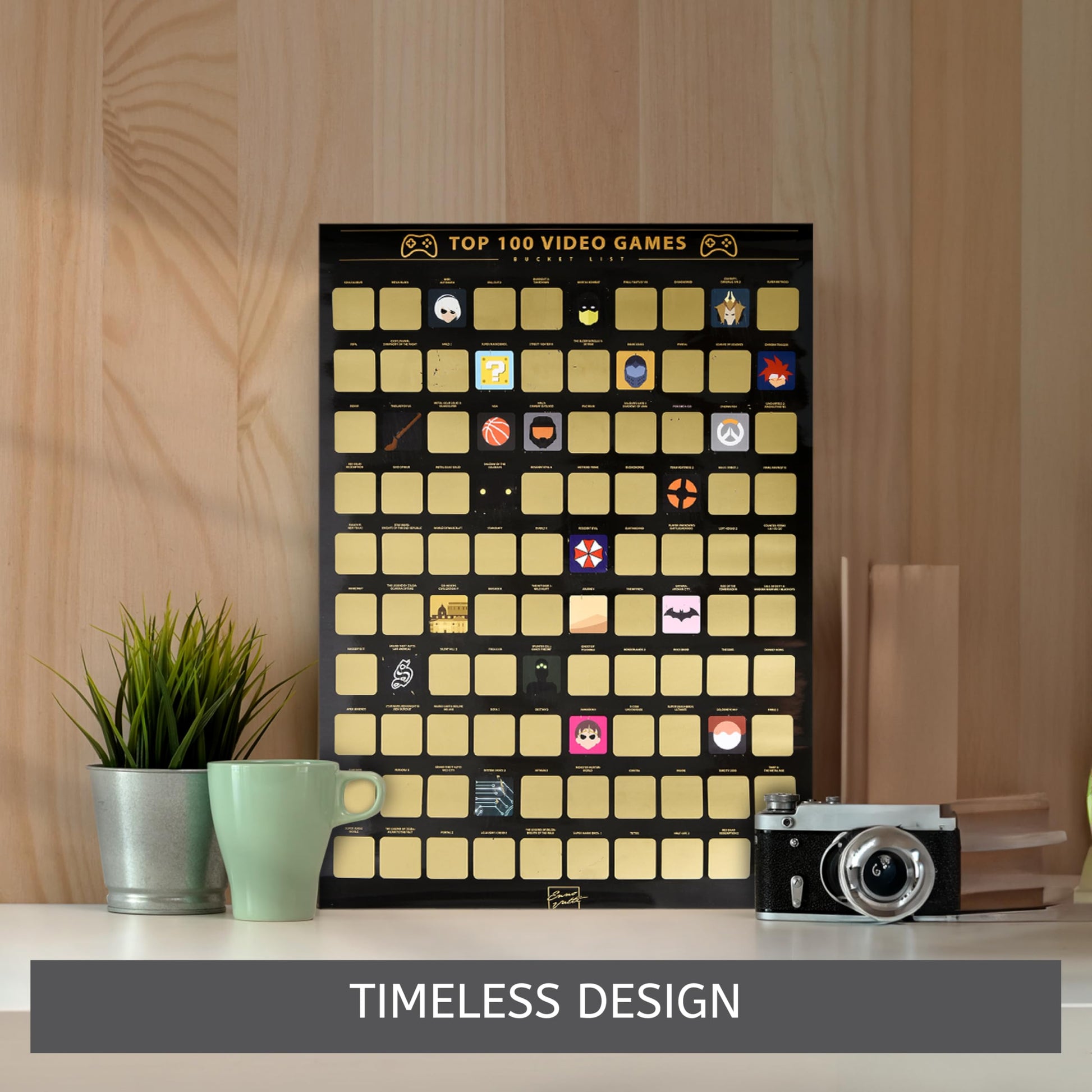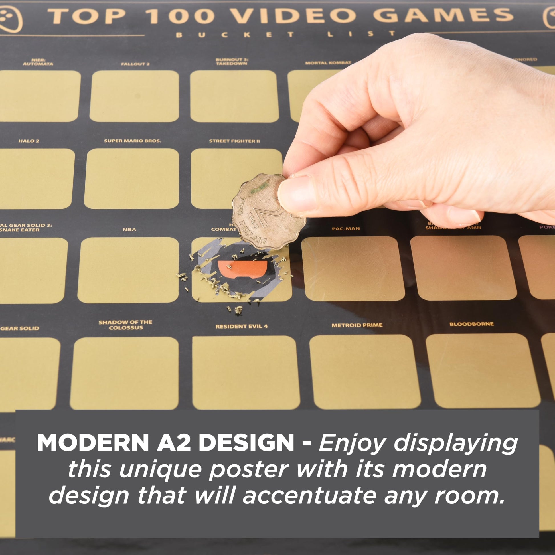 - TOP 100 VIDEO GAMES SCRATCH OFF POSTER: Celebrate your love for gaming with our scratch-off poster showcasing 100 iconic video games. Kids and adults alike will enjoy this interactive bucket list
