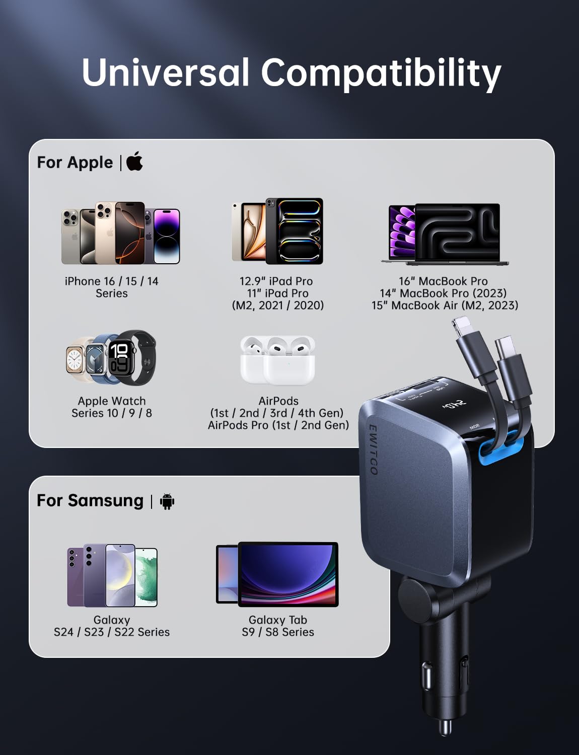 - Sustainable and Reliable: EWITGO prioritizes eco-friendly practices while delivering durable, long-lasting products. The EWITGO retractable fast car charger reduces the need for frequent replacements, making it a sustainable choice for those seeking a car charger with different charging ports. Whether you're shopping for car gifts for men or reliable semi truck accessories, this charger is built to last