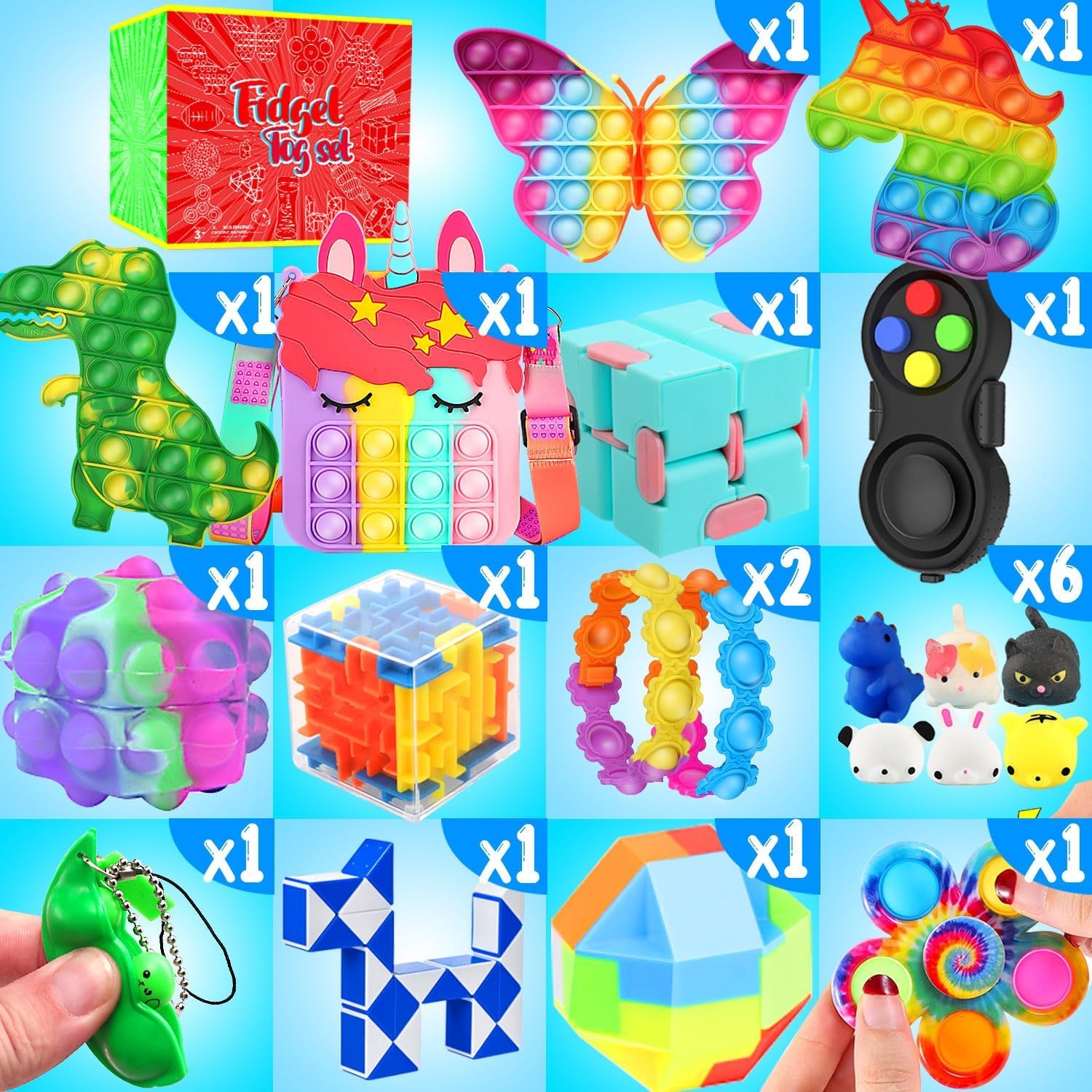 - PACK OF 126: 3 Pop Bubbles, 1 Pop Purse, 6 Mochi Squishies, 6 Stretchy Strings, 3 Marble Mesh Fidget Toys, 1 Snake Cube Twist, 1 Tracks Snap, 1 Fidget Controller, 1 Infinity Cube, 2 Puzzle Boxes, 1 Squeeze Soybean, 1 Pop Fidget Spinner, 2 Pop Bracelets, 8 Foam Putty, 10 Stickers, 1 Spiky Ring, 1 Pop Ball, 20 Spiky Balls, 1 Football Foam Ball, 20 Pop Rings, 30 Mini Pop Bubbles, 3 Mini Fidget Spinners and 3 Pop Tubes