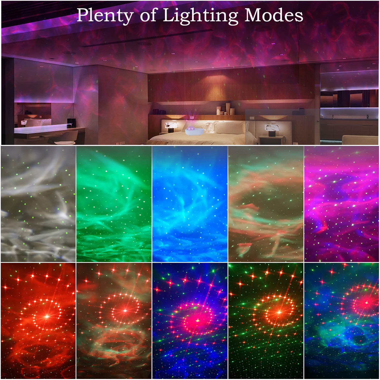 - STAR AND OCEAN WAVE PROJECTOR : This trippy lighting projector is a 3-in-1. It oozes out Visual of Stars, Colourful Ocean Waves and the Nebula of Space into the ceilings and walls of your room. The support of 10 color-changing modes (Combinations of Red, Blue, Green and White) makes it as a unique décor for the home and parties. It helps you to set a romantic relaxing mood in your bedroom as well.