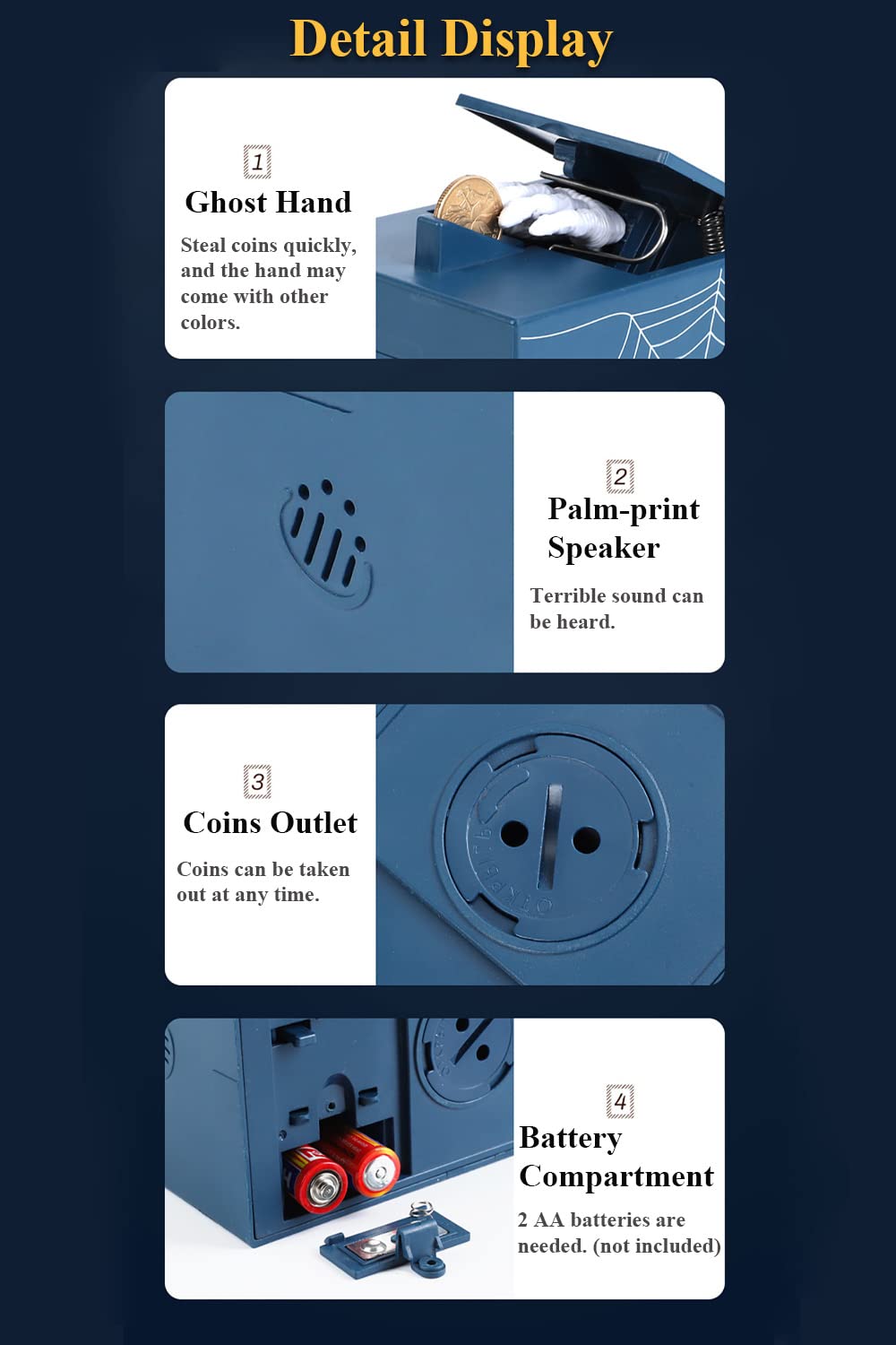 - Funny Ghost Hand Piggy Bank: A ghost hand hiding inside the box and are ready to grab the coin at any time if there is a coin is found by him. In addition, terrible sound effect can be heard when the ghost hand appears.