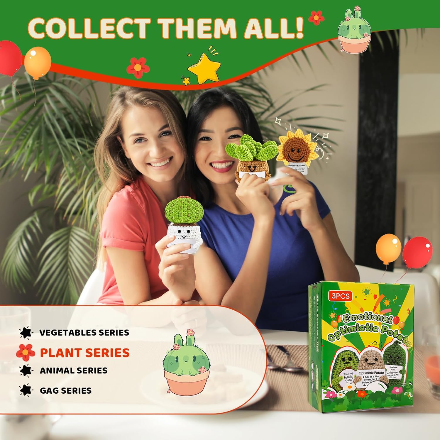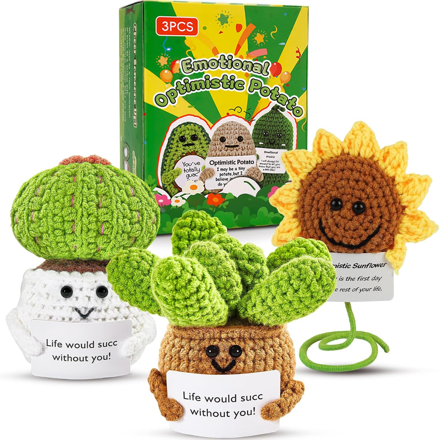 Gifts for Women Men Emotional Potato Pickle: 3Pcs Funny Crochet Dolls Christmas Stocking Stuffers Friends Coworkers Roommates College Students Sister with Cheer Up Cards (Cactus,Sunflower,Succulent)