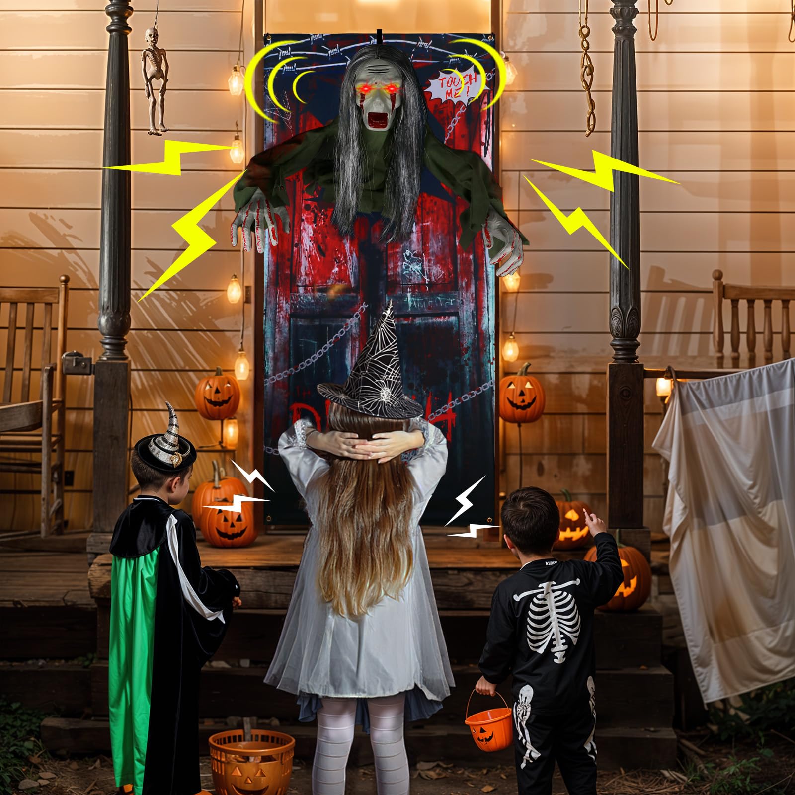 - Halloween Door Decor Package: Zombie Halloween decorations include a 6.6FT Porch Haunted Mansion Backdrop, the colors are bright and lifelike, giving people a visual sense of breaking out of a door. the hanging ghost comes equipped with a hook, allowing for easy installation on your front door or porch without additional tools. This backdrop sets the scene for the animated ghost, transforming your front door into a haunted portal