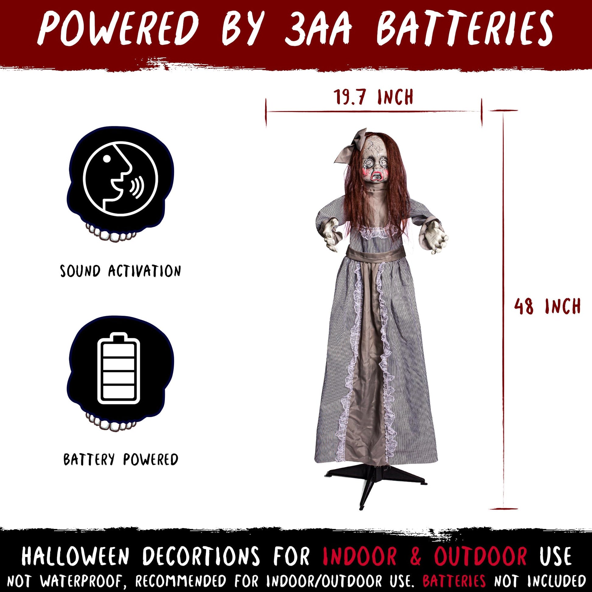 Halloween Animatronics 4ft Creepy Doll Decoration - 48inch Animated Scary Talking Doll with Sound Activated, Creepy Voice, Spooky Move, Light-Up Eyes, Horror Prop for Indoor, Outdoor, Yard Lawn