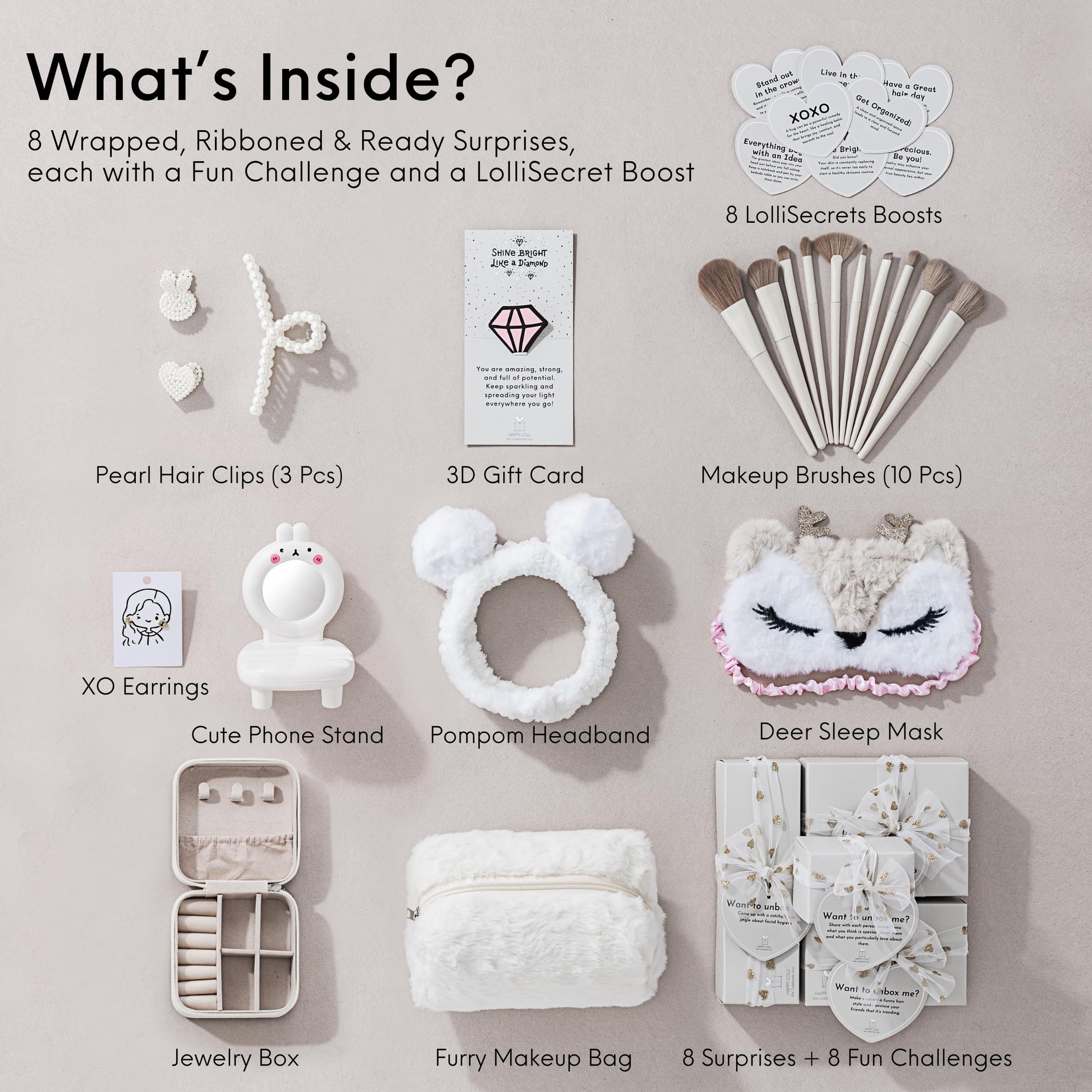 - Includes 8 High-Quality Surprises - Jewelry Box, 10 Makeup Brushes, XO Earrings, Cute Phone Stand, White Furry Makeup Bag, Fluffy Deer Eyes Sleeping Mask, Pompoms Headband, and Three Pearl Hair Clips.