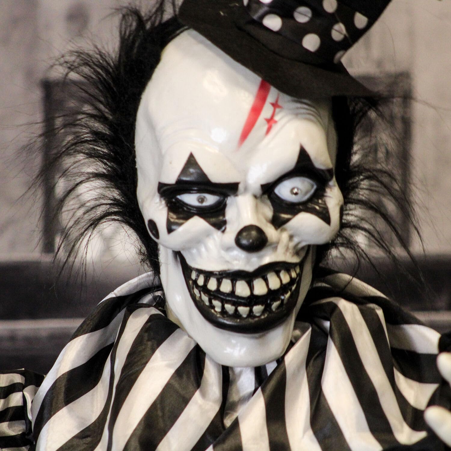 Details: Be very afraid of Haunted Hill Farm's collection of spooky animatronics. These blood curdling creatures are sure to terrify any trick-or-treaters, coworkers, or customers. This clown's eyes flash a haunting red as he chuckles with evil delight, moving his limbs ominously. 'That’s it, come closer,' he’ll beckon. Dressed in an eerie black and white clown costume, slathered in dark makeup, and surrounded by sinister circus music, he proves he wasn’t hired for laughs. He features detailed head and hand sculpts with textures to give a hauntingly realistic look. Battery operated with poseable arms, he includes a stand so you can display him wherever you want. His ominous half figure can fit seamlessly next to your haunted treats on any counter space or on the ground to give the appearance of him bursting through the soil. For longer prop life, we recommend indoor or sheltered outdoor use protected from inclement weather. For thrills and chills so frightening that your neighbors will run shrieking in horrendous delight, count on Halloween decorations from Haunted Hill Farm.