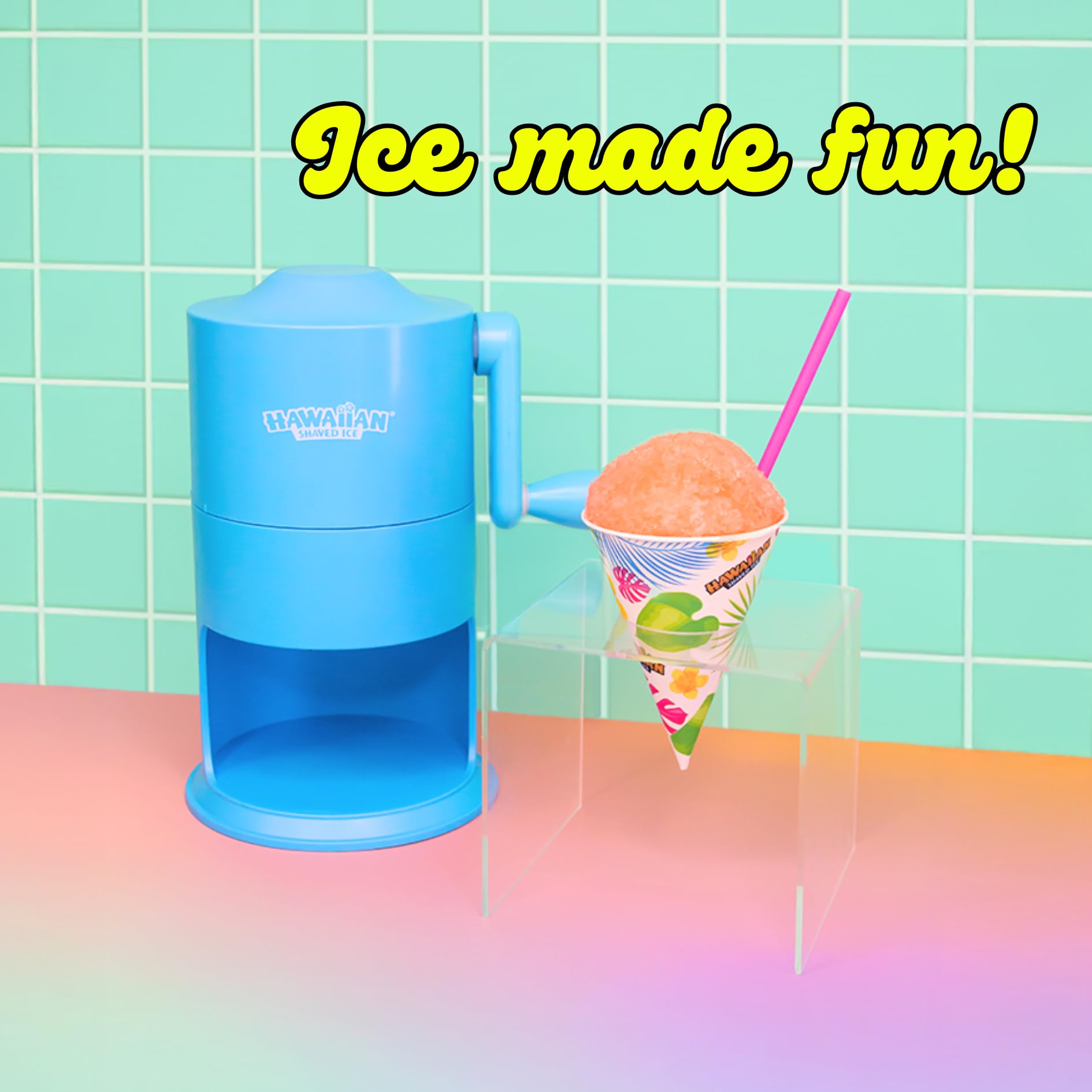 - Tasty frozen confections with a few turns of the handle! This countertop ice shaver machine is fully manual, so you don't need to worry about looking for an outlet or recharging batteries. Just add the ice block or cubes into the top, close and lock the top, and you're good to go. There may be some 'splash back' into the top loader, but won't leak out and make a mess. For smooth performance, limit loose ice cubes to the same height as the ice block.
