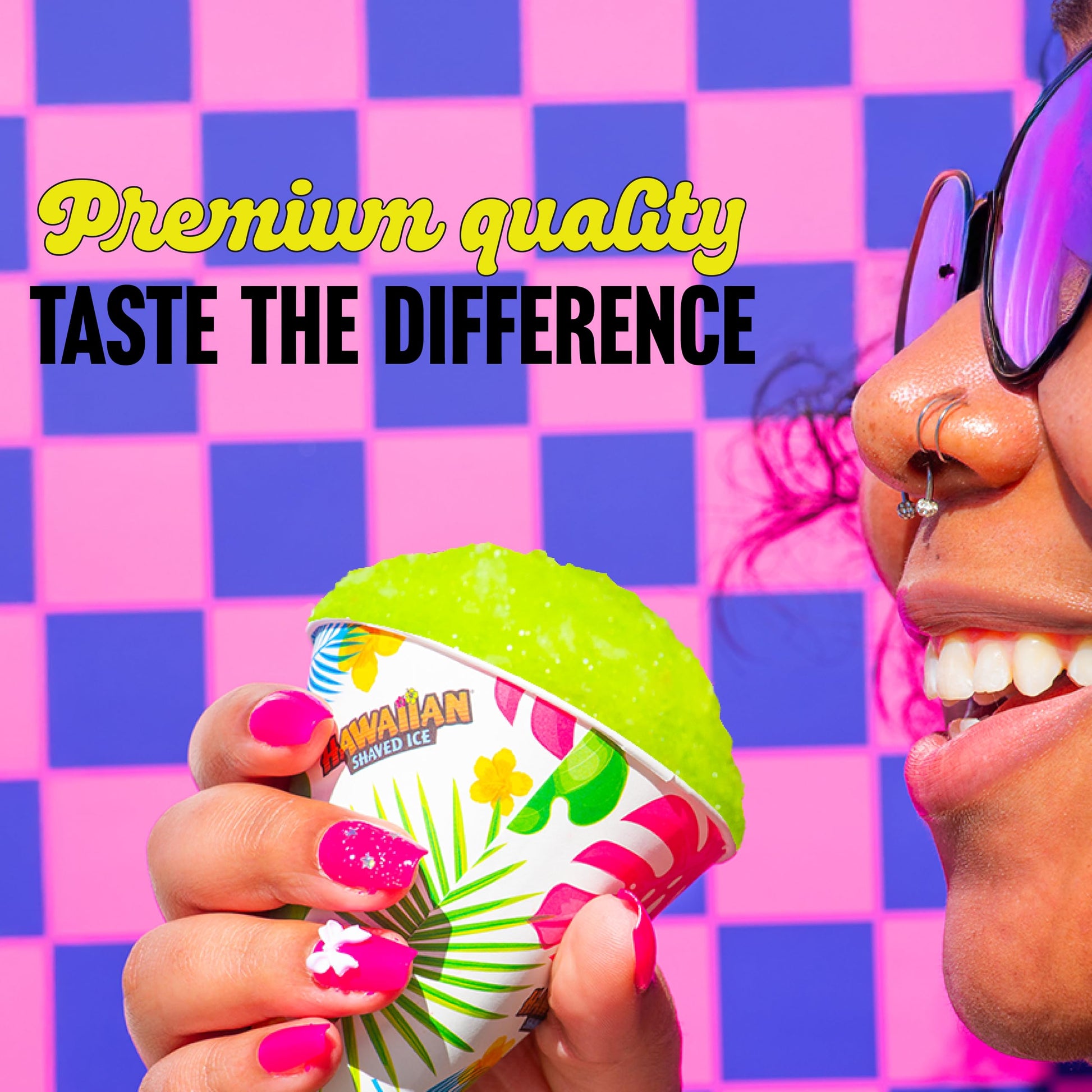 - No need to add water. Made in the USA with high fructose corn syrup, and natural & artificial flavorings. A 2oz pour for each snow cone yields 8 servings per bottle. A big hit at your next birthday party! All the essentials for the traditional Hawaiian shaved ice kids love. Cups and straws are included.