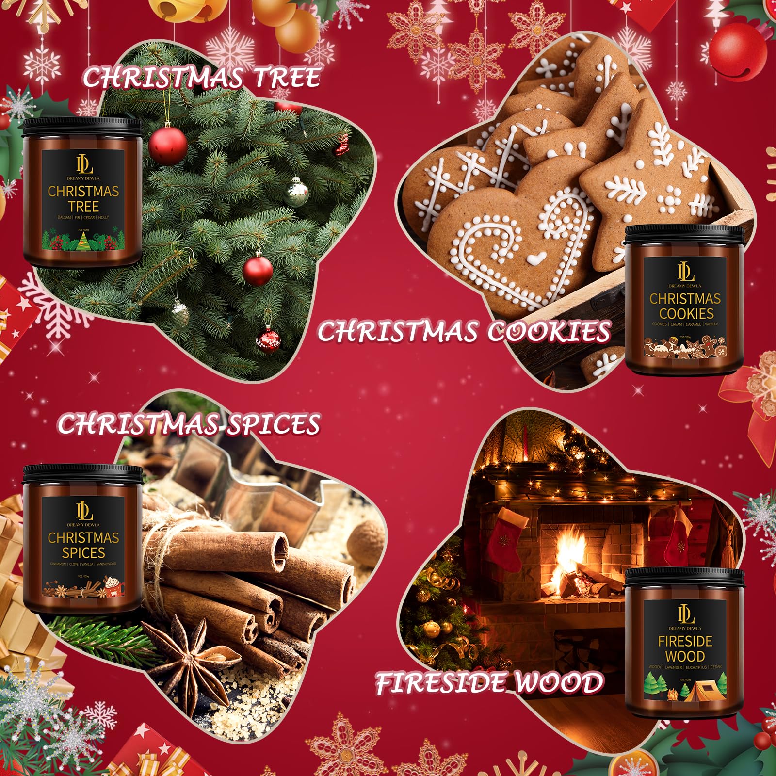 - 4 Pack Christmas Candle Set: Our Christmas candle set features a selection of 4 festive scent combinations, Christmas Tree, Christmas Cookies, Christmas Spices, and Fireside Wood Scent. Each scented candle brings colorfulness to your life during the Christmas season and creates a warm Christmas atmosphere in every moment.
