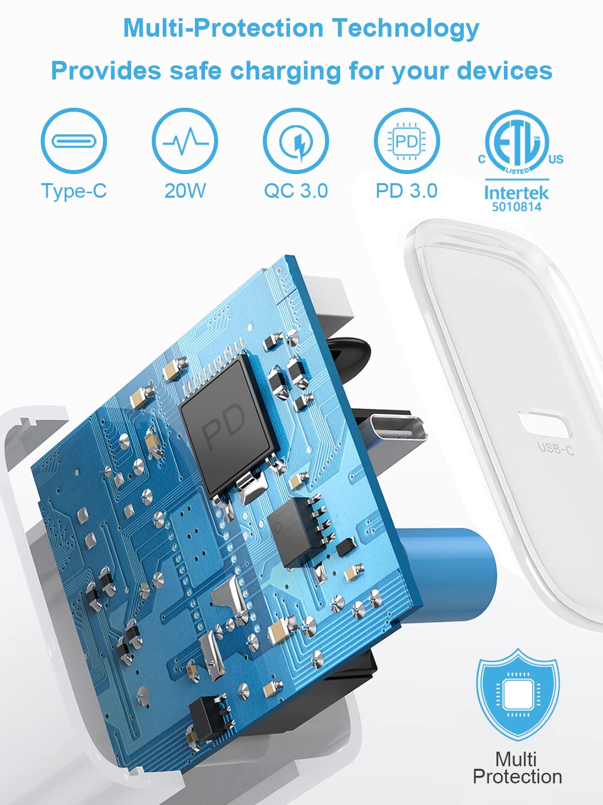 - [Safety Efficient Fast Charging] 20W Charging charger has multipotent safety system ensures complete protection for your Charging devices. The ETL certified wall charger built-in over-voltage protection, features a stable voltage. Lightning cable built-in smart chip to match the current required by devices automatically to protect your i Phone/iPad from overcurrent, overvoltage, short circuit and overheating