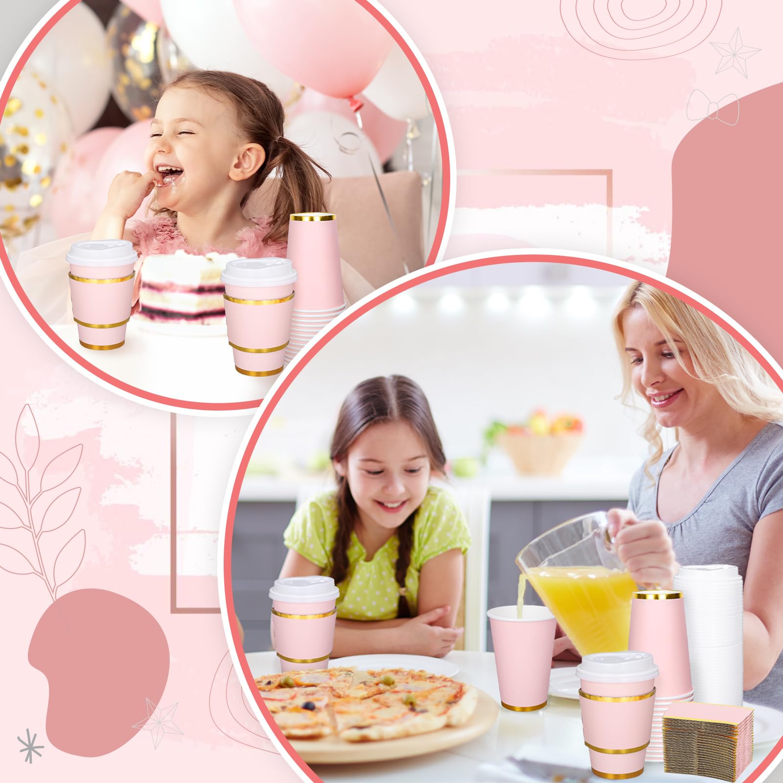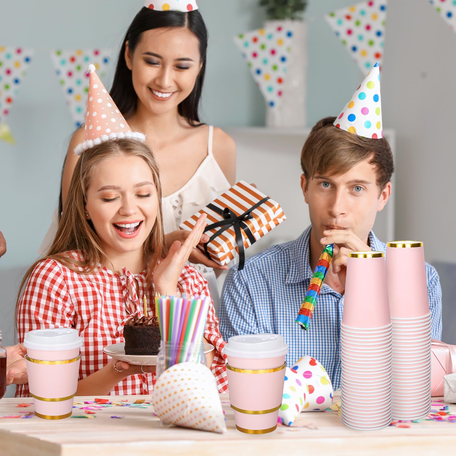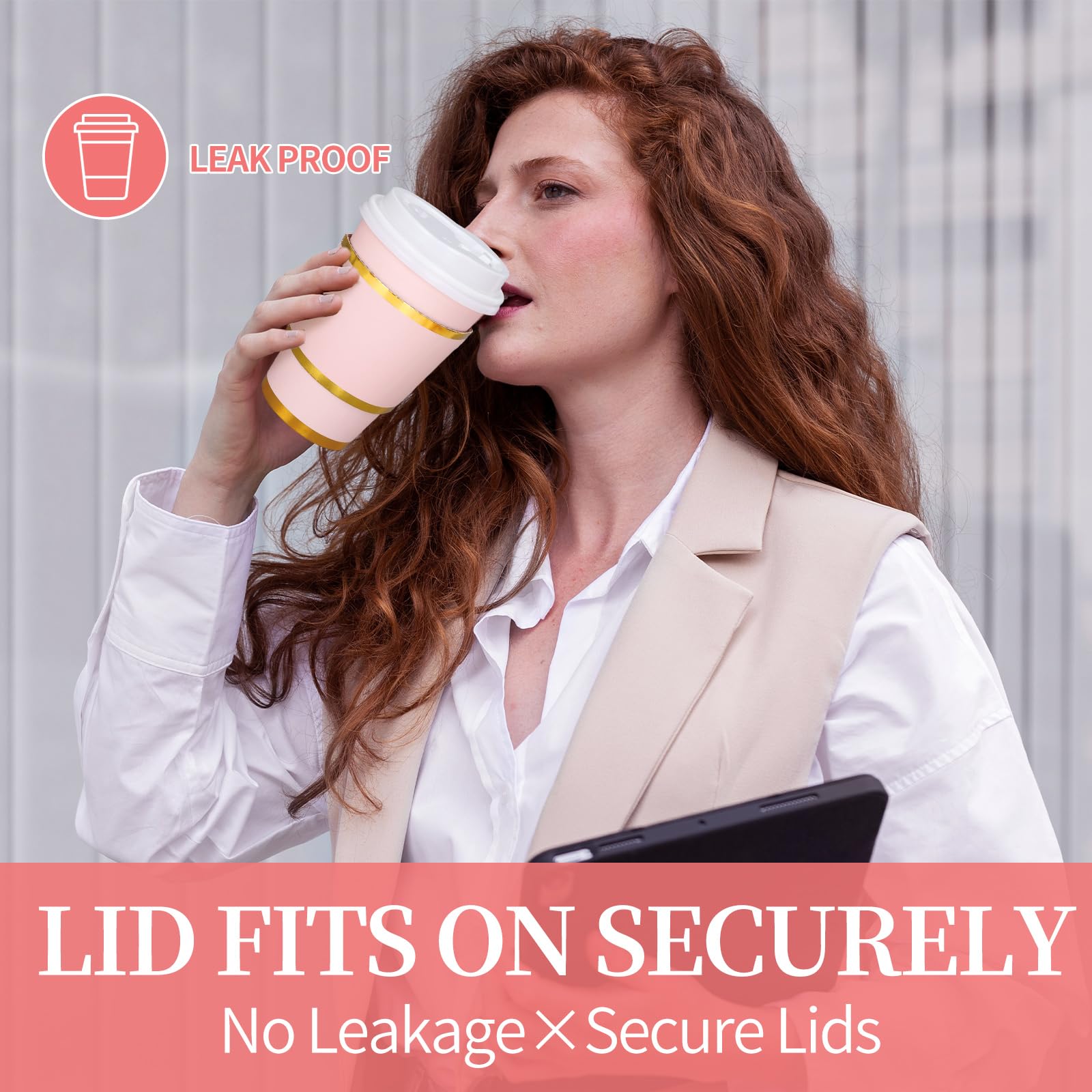 JarThenaAMCS 50Pcs Light Pink Disposable Coffee Cups with Lids and Sleeves 12Oz Foil Gold Border Pink Party Paper Tableware for Wedding Holiday Picnic Birthday Party Bridal Favor Coffee Beverage Tea