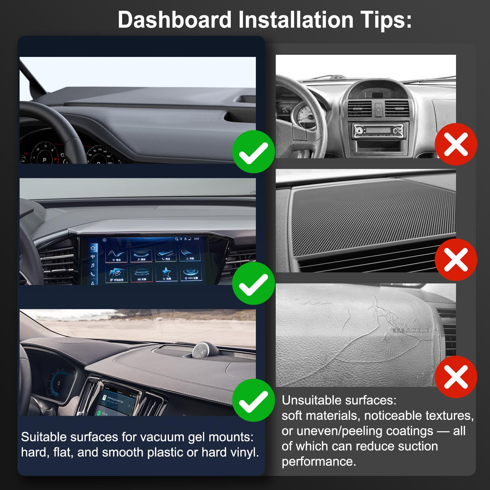 - Vacuum Lock + Gel Base — For Smooth, Flat Surfaces: Features a rotary vacuum-lock and 4-layer washable gel base that forms a rock-solid hold on flat, non-textured surfaces such as glass, glossy dashboards, or hard leather. Avoid use on curved, soft, or textured materials. To install, firmly press the gel base and rotate the vacuum lock clockwise until tight