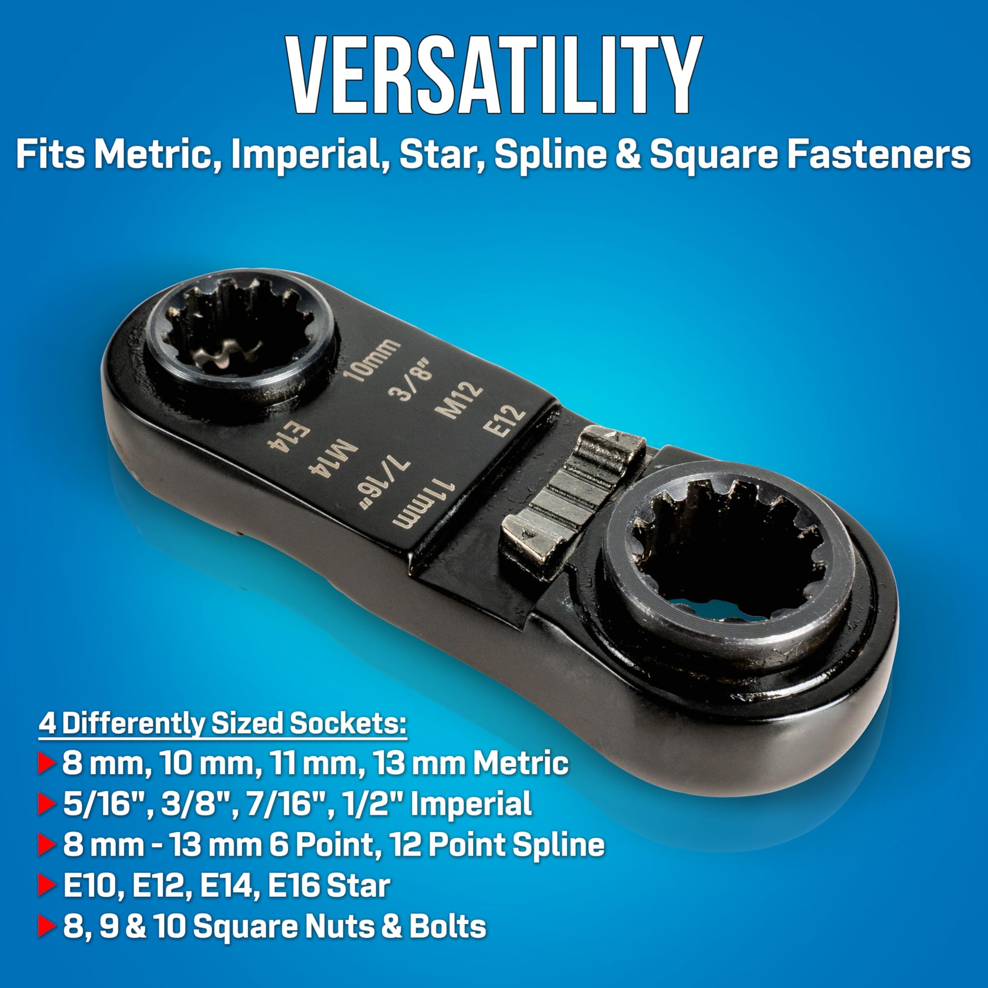 - VERSATILE SOCKET SET: Includes 4 different sockets for 8 mm, 10 mm, 11 mm, and 13 mm metric sizes, as well as 5/16', 3/8', 7/16', and 1/2' Imperial sizes.