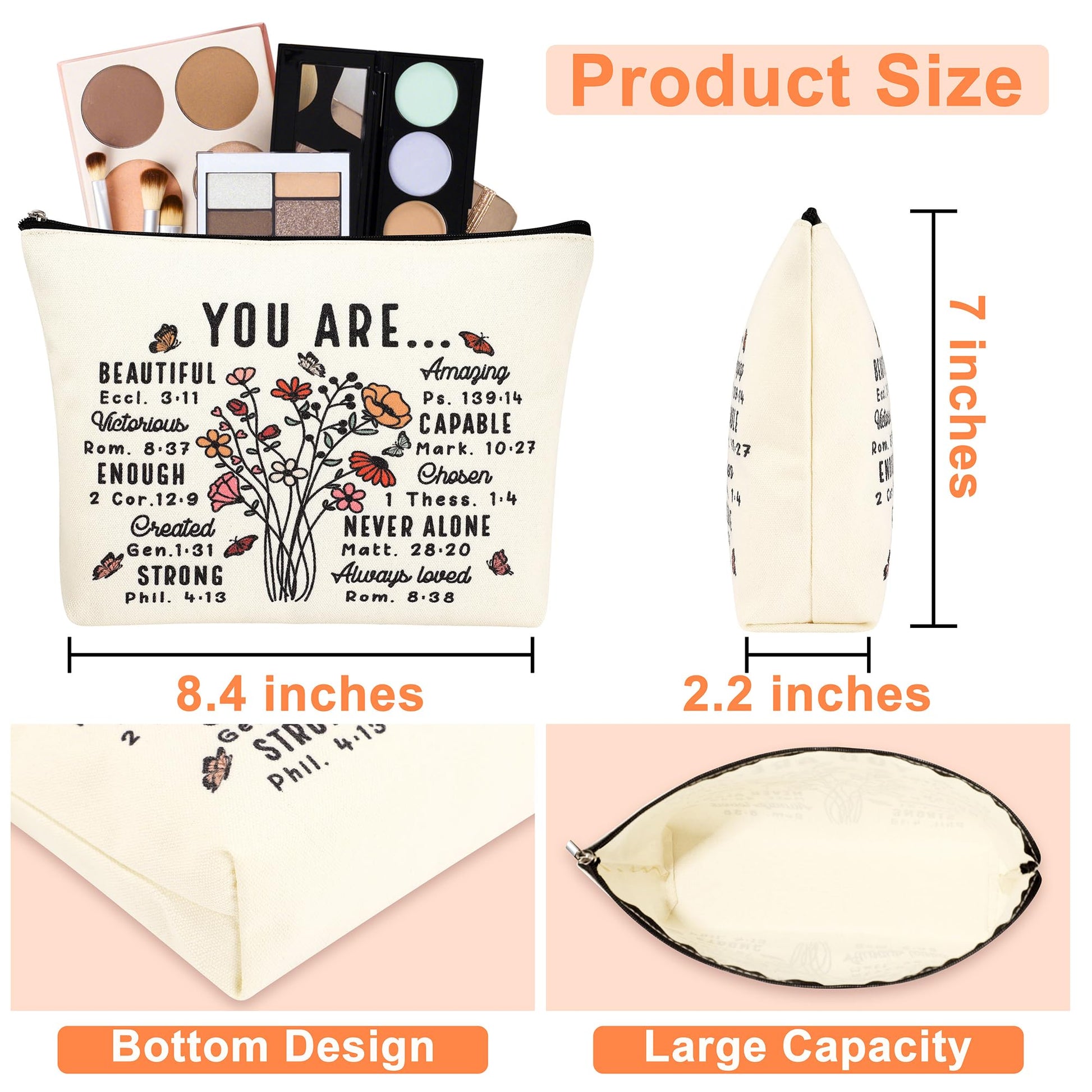 - đăChristian Gifts for WomenăThe 7-piece Christian Gifts Set is a decent choice, 1 x 16 Oz can glass with lid and straw, 1 x double-sided printied, high quality coating Makeup Bag, 1 x exquisite printed tote bag, 1 x pink dried flower greeting card, 1 x stainless steel keychain with a cross printed on it, 1 x christian affirmation cards, 1 x pink zebra bracelet with white cross and card. Express your love and best wishes to her. Make her feel special, feel that it must be so wonderful.