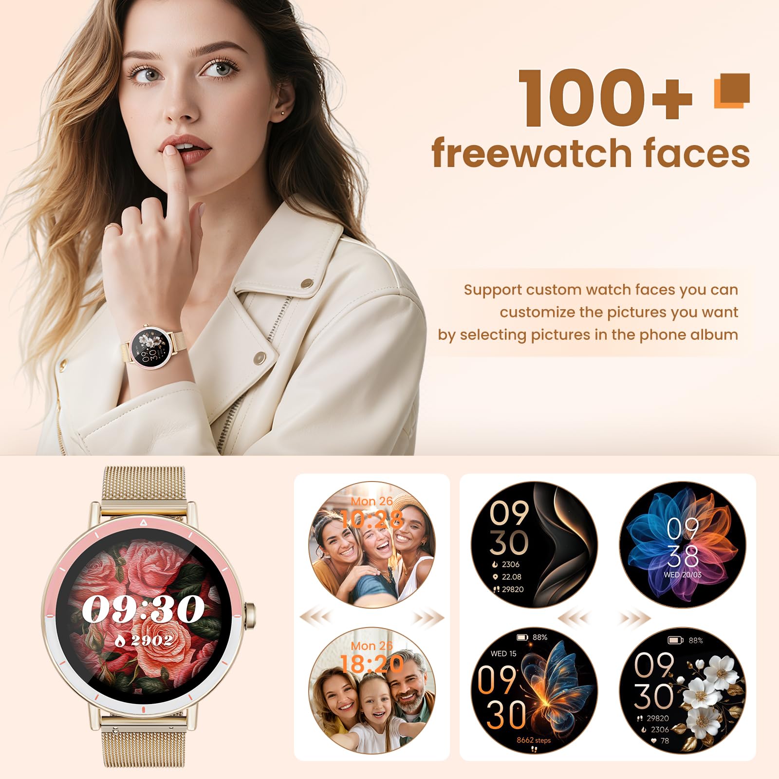 - All Day Health Monitoring:This smartwatch for Android and Iphone is equipped with advanced sensors that provide insights to help you better understand your health and adjust your lifestyle. It not only can monitors your health indicators (heart rate, blood oxygen, sleep), but also records women's menstrual period. It can also automatically monitor your sleep status and provide a comprehensive sleep quality analysis to help you have a better sleep.