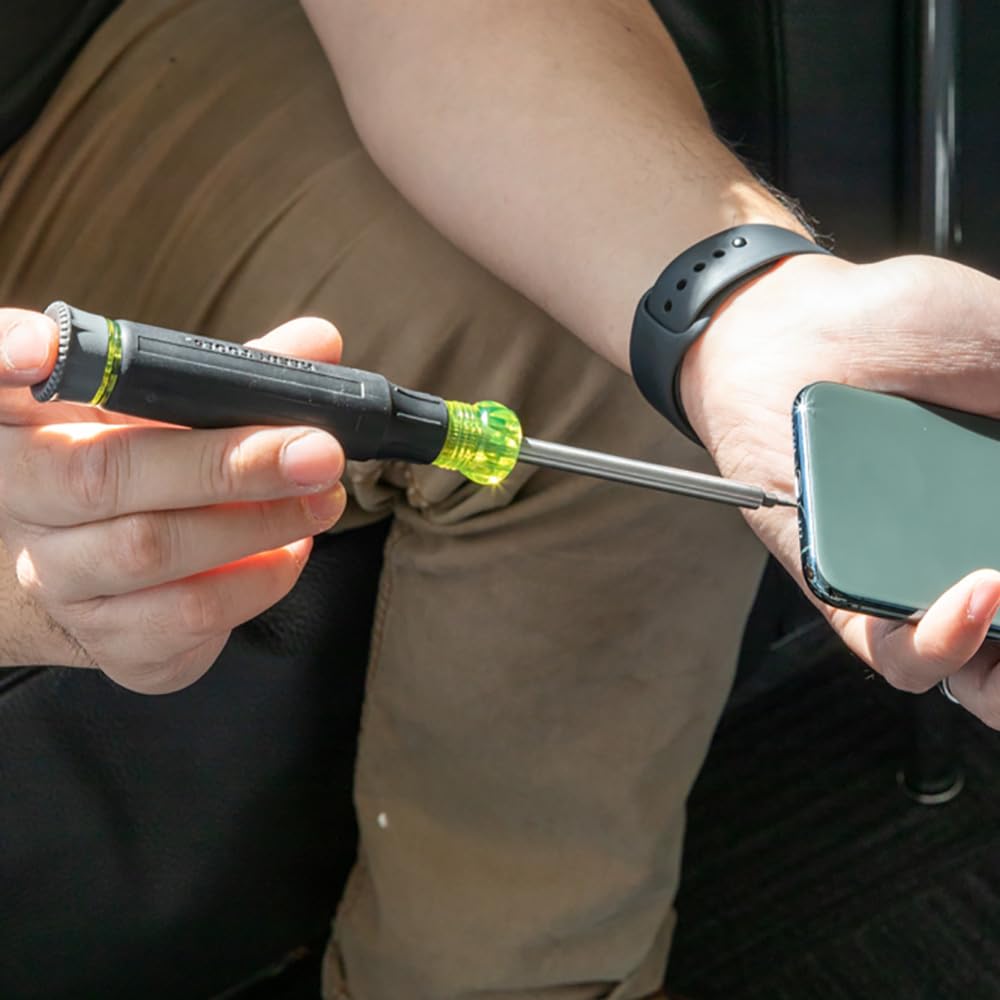 Details: The 27-in-1 Multi-Bit Precision Screwdriver offers 26 specialty bits conveniently stored in the handle plus an integrated 3.5 mm nut driver. This tool includes bits for repair of most Apple products. The powerful Rare-Earth magnet in the barrel securely holds bits and fasteners. This screwdriver features industrial-strength bits as well as Cushion-Grip handles with spin caps for outstanding comfort and control. For more than 160 years, Klein Tools has manufactured premium-quality, professional-grade hand tools that deliver the performance, durability and precision needed to get the job done right. Our family of engineers, workers and craftsman continue to put six generations of expertise into every tool we create by using only the highest quality materials, superior workmanship, and keeping manufacturing as close to home as we can. Klein isn't just the name of our company, it's also our family name. And since we're an American company that's family-owned and family-run, you know you can count on us to be here tomorrow. Klein Tools doesn't just make great products, we make great products that stand up to the demands of the professionals who use them every day ... Since 1857.