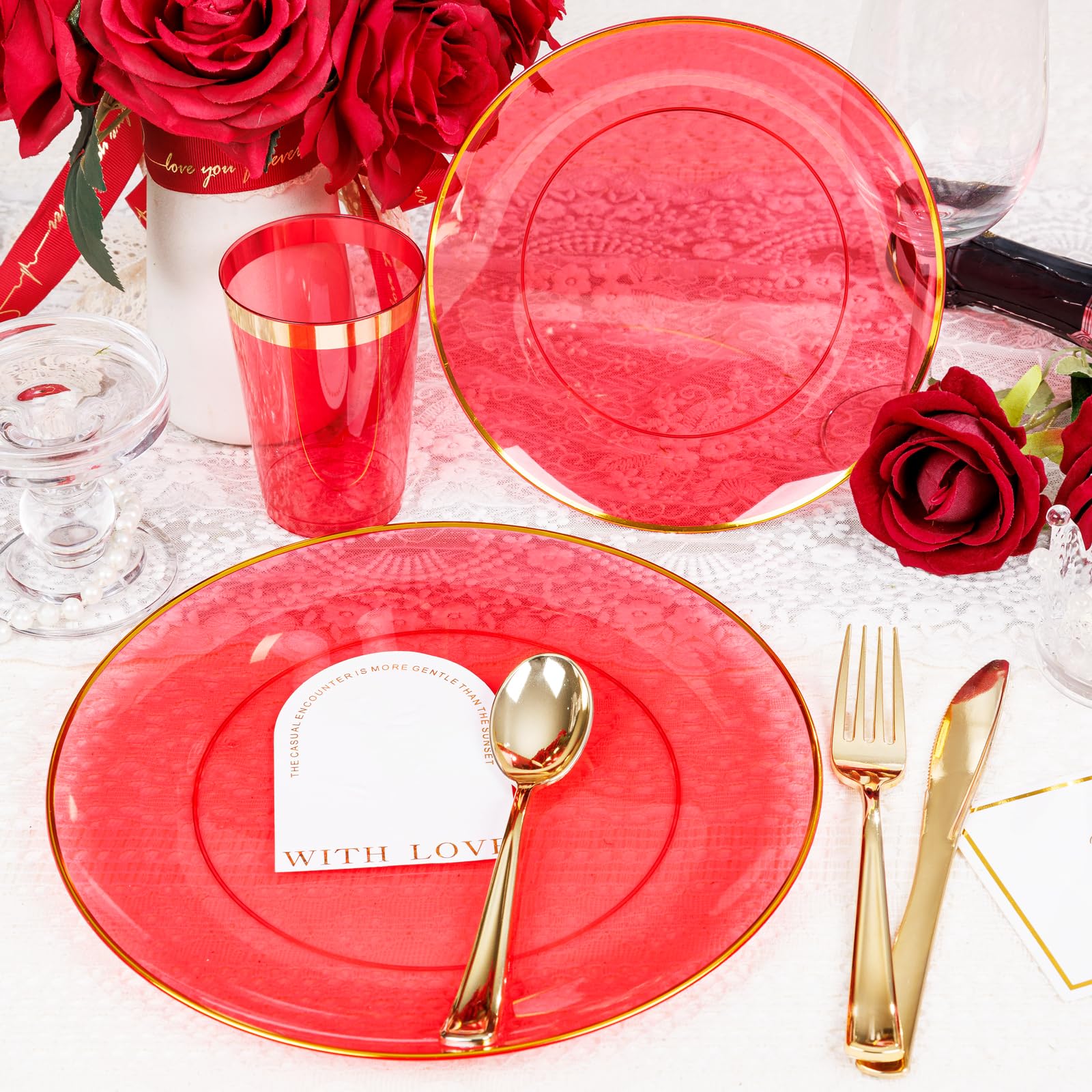 LIYH 180 Pcs Clear Red Plastic Plates Disposable - Red Dinnerware Set, Include Red and Gold Plates, Dinner Plate, Dessert Plate, Gold Plastic Silverware for Birthday Party