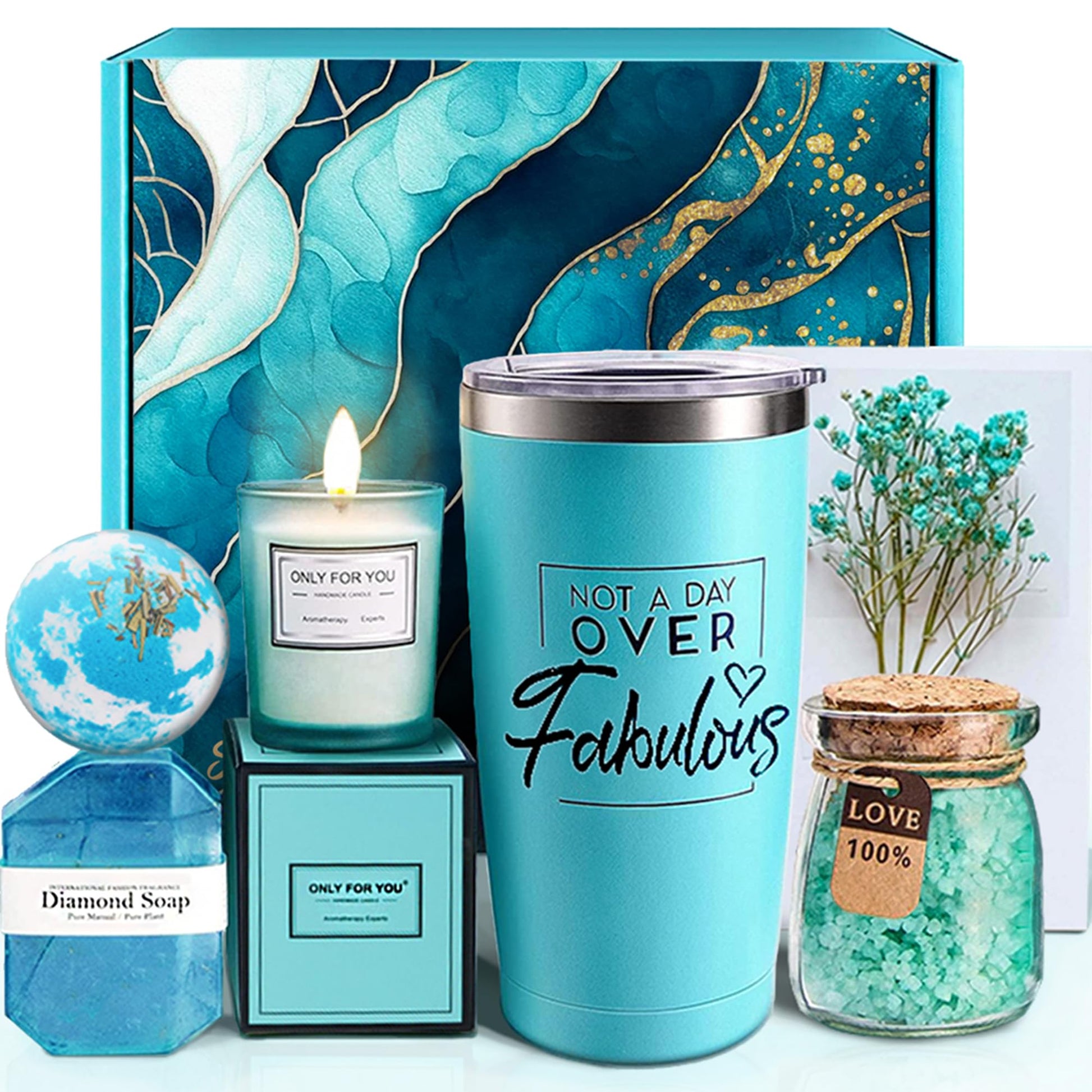 - 【Essential 6-Piece Gift Baskets】Give her a memorable experience and let Her Feel your love. Our luxury 6-Piece Gift Baskets include six beautifully packaged items - a 20 oz insulated Stainless Steel Tumbler with 'Not A Day Over Fabulous' engraved on it, a Bath Bomb, a Bath Salt, aromatherapy Candle, a pure handmade diamond soap and a lovely Dried Flower Greeting Card. Unforgettable Unboxing will impress Her at First Sight.